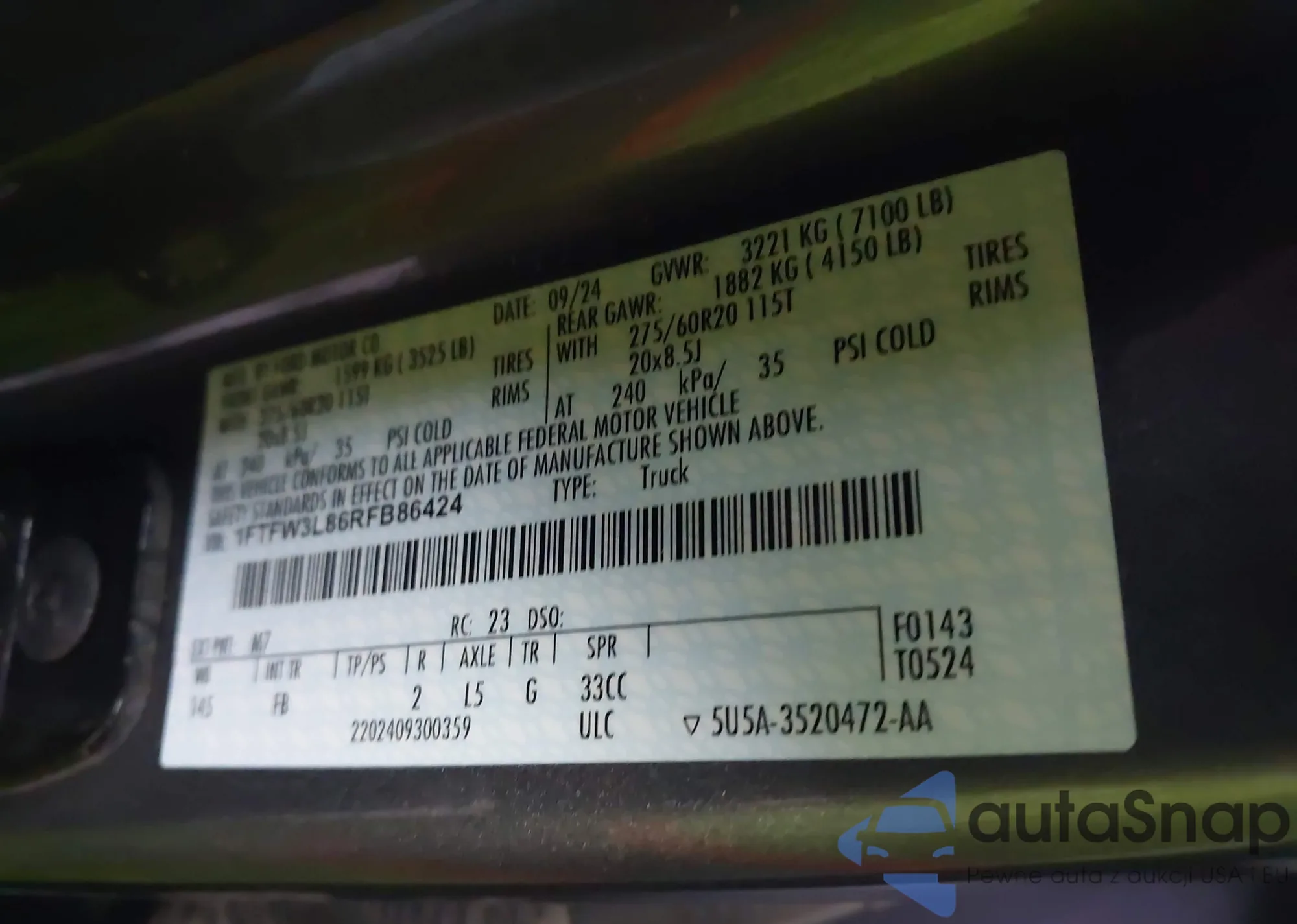 LOT: 43724519 VIN: 1FTFW3L86RFB86424