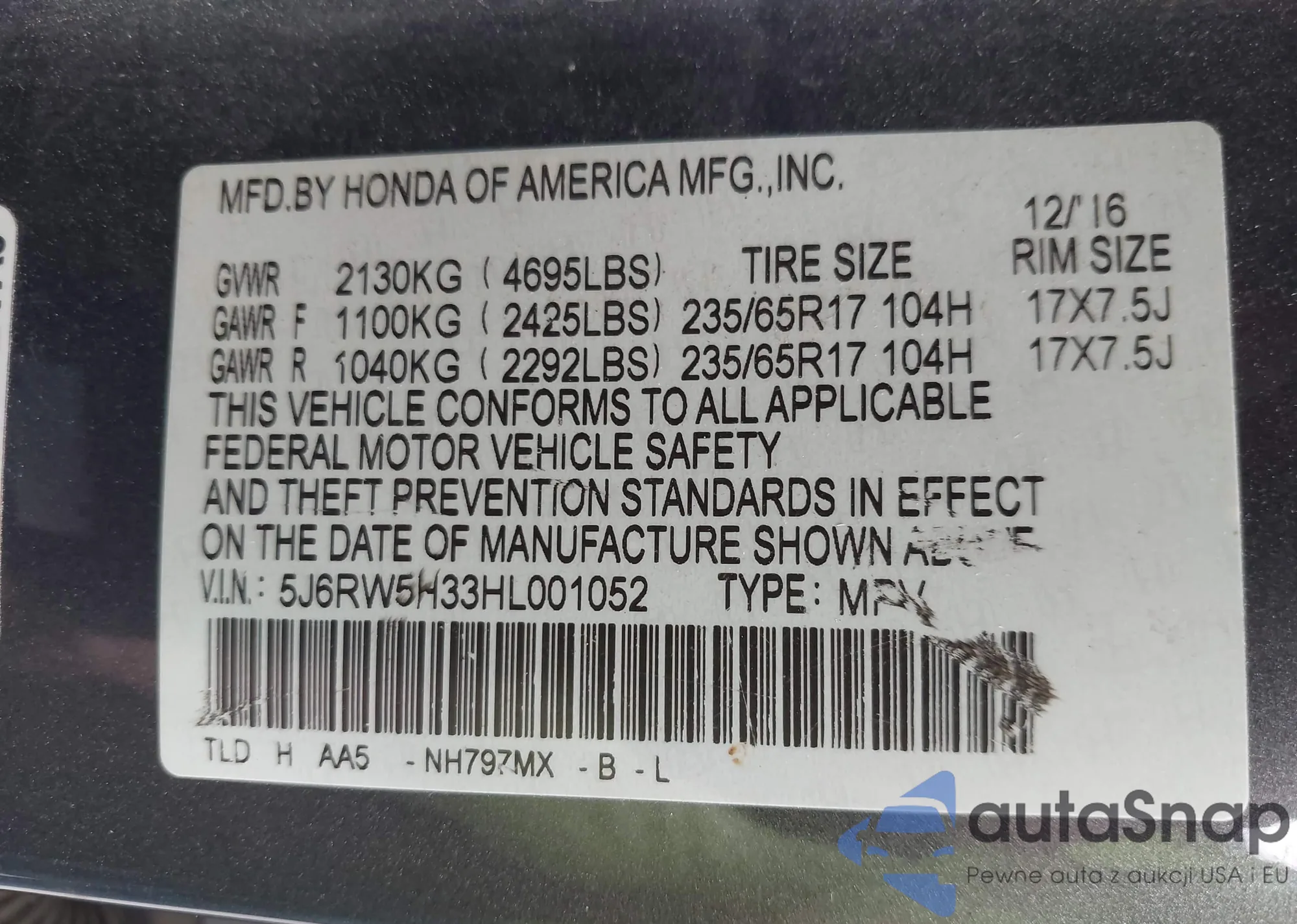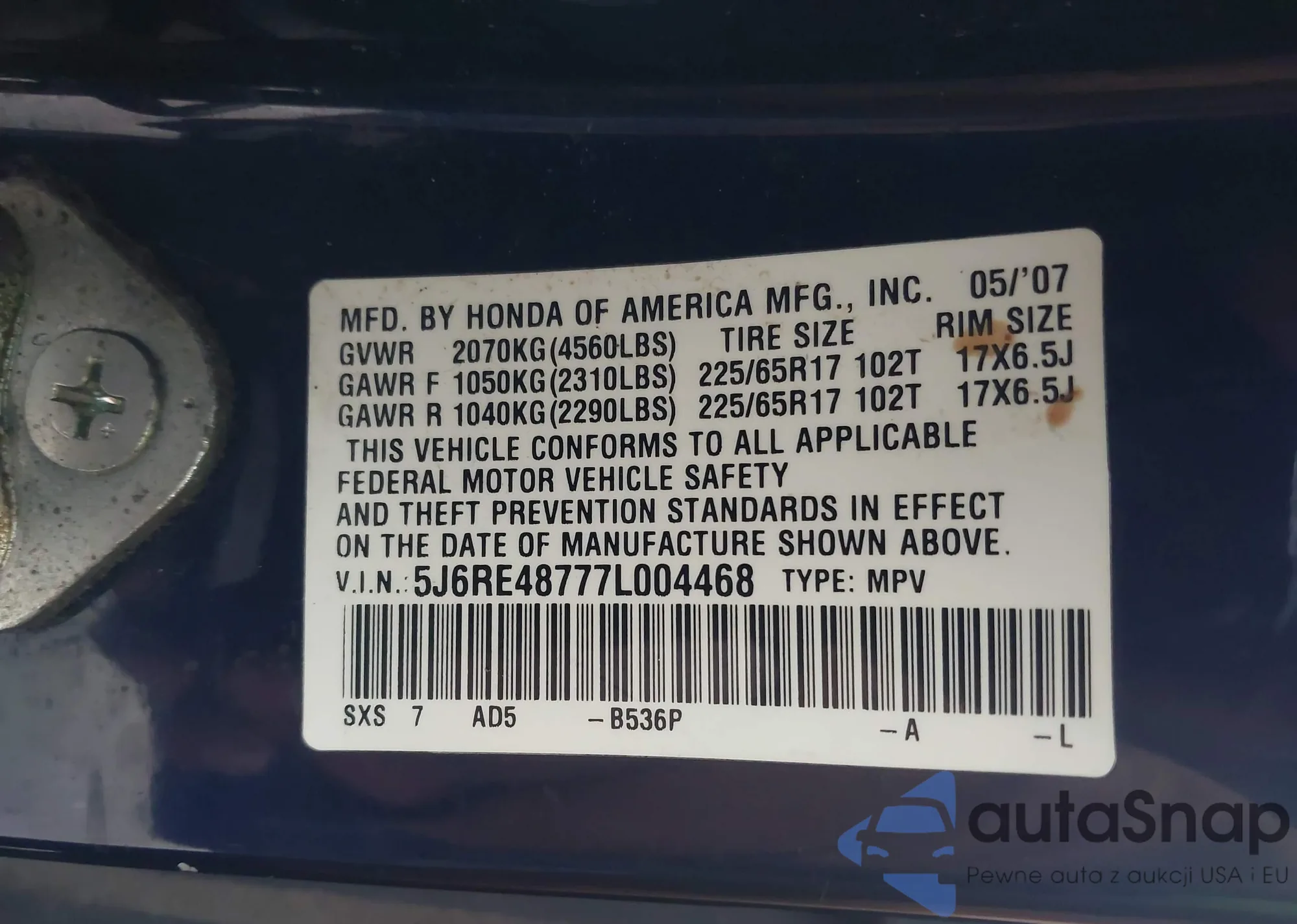 • VIN 5J6RE48777L004468
