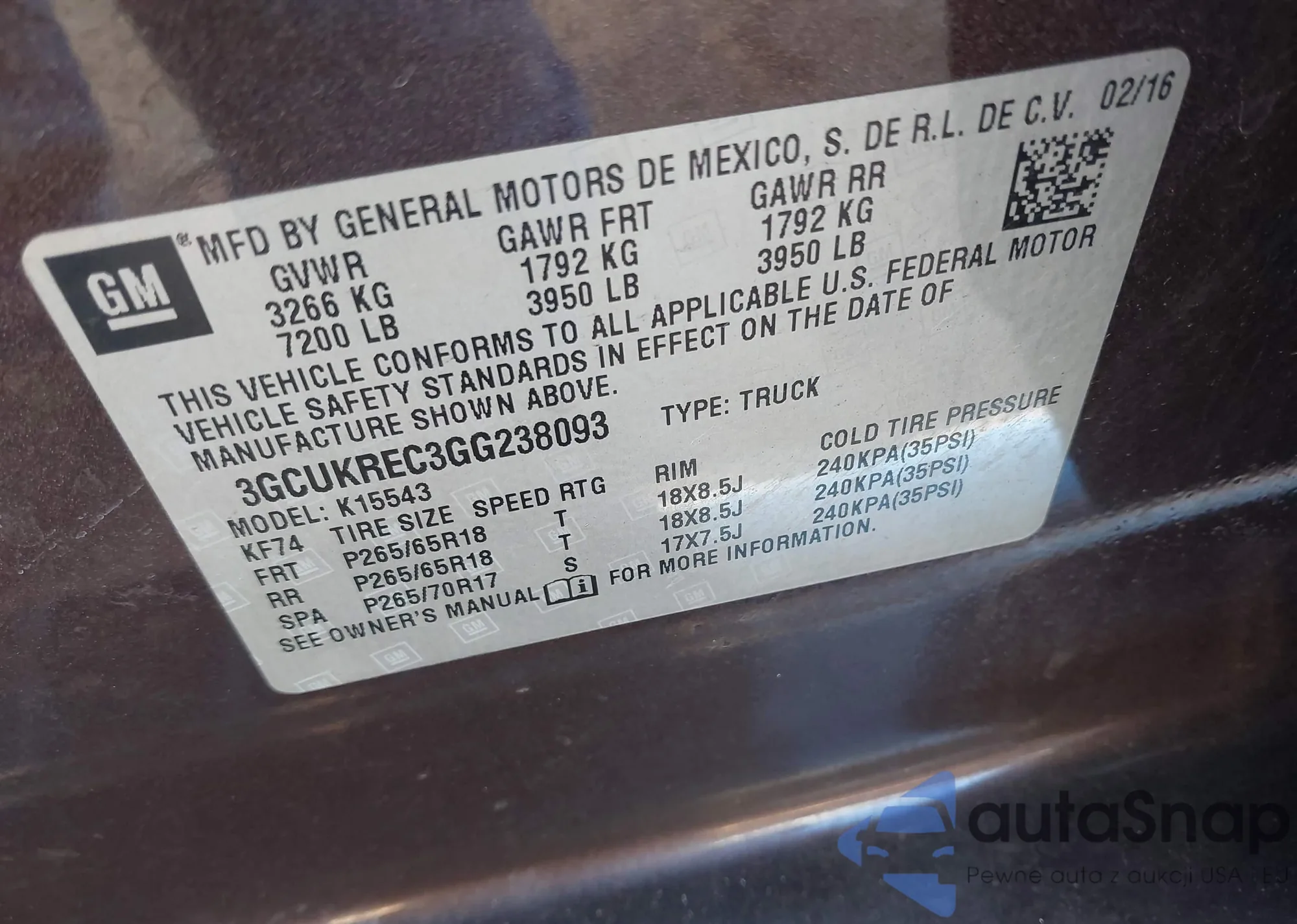 LOT: 44048670 VIN: 3GCUKREC3GG238093