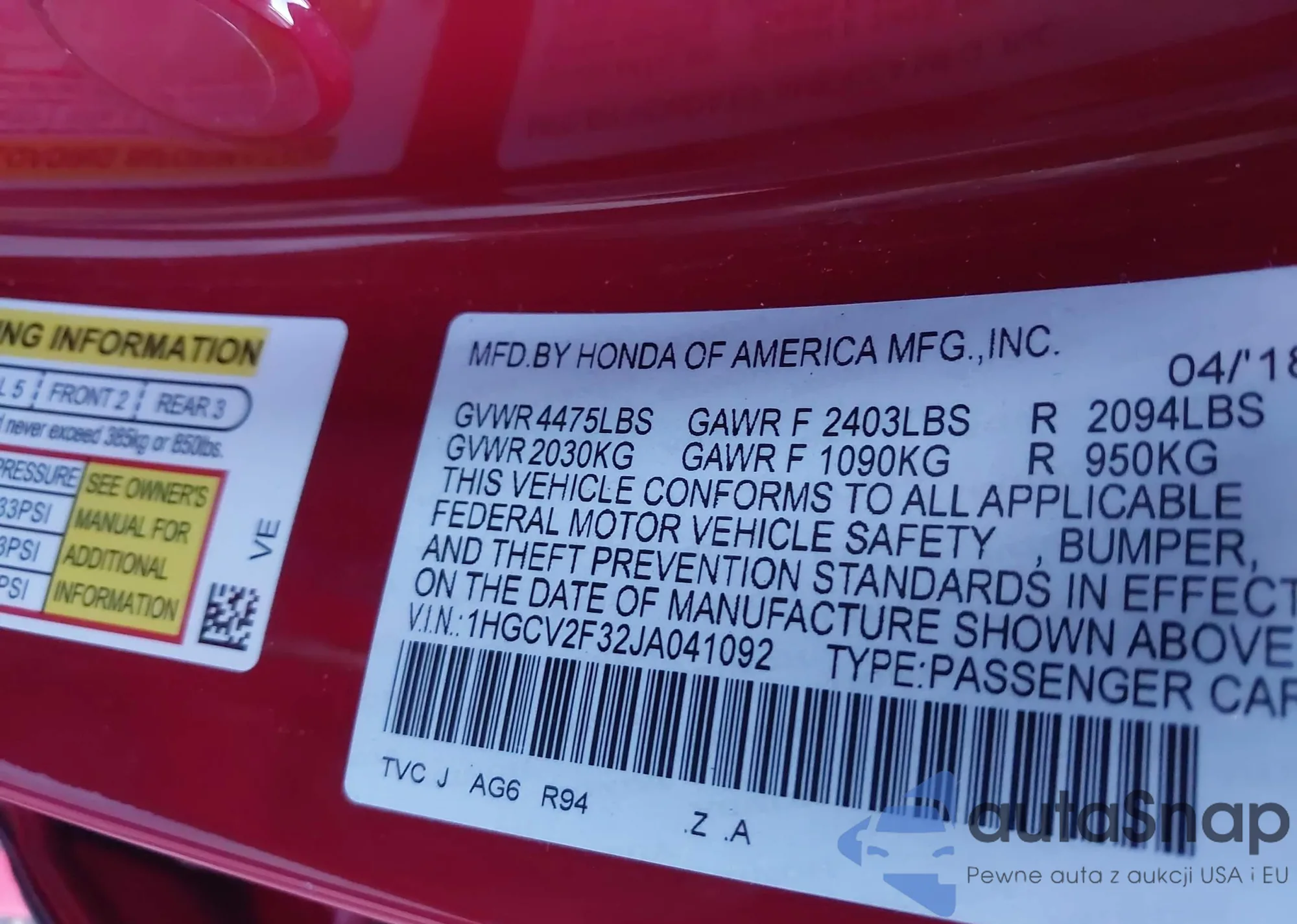 LOT: 44031388 VIN: 1HGCV2F32JA041092