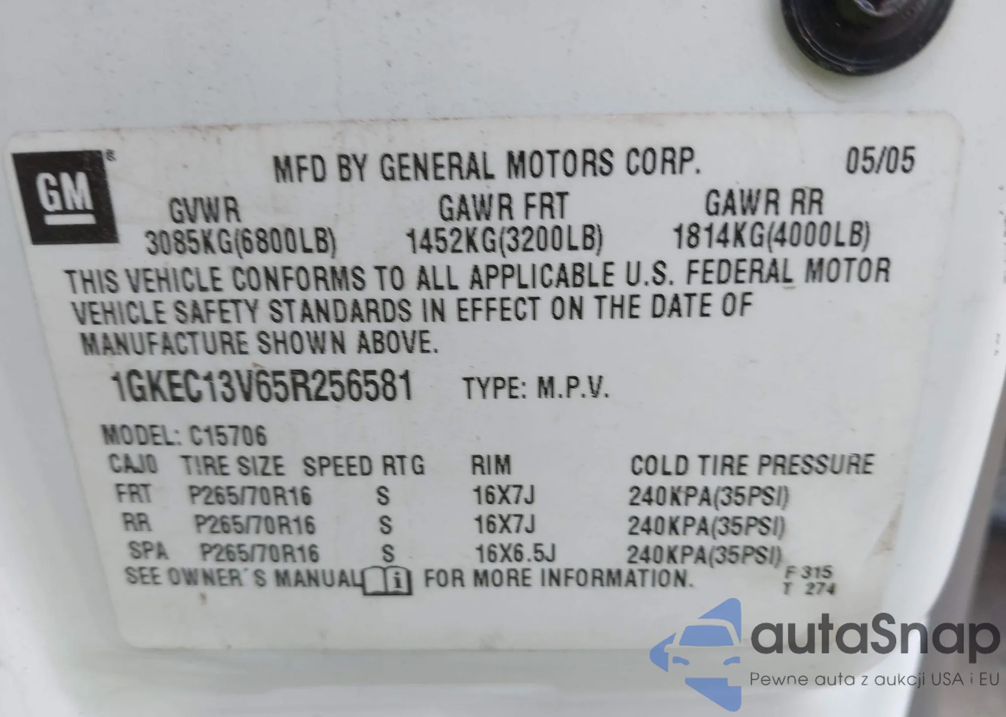 LOT: 43874777 VIN: 1GKEC13V65R256581