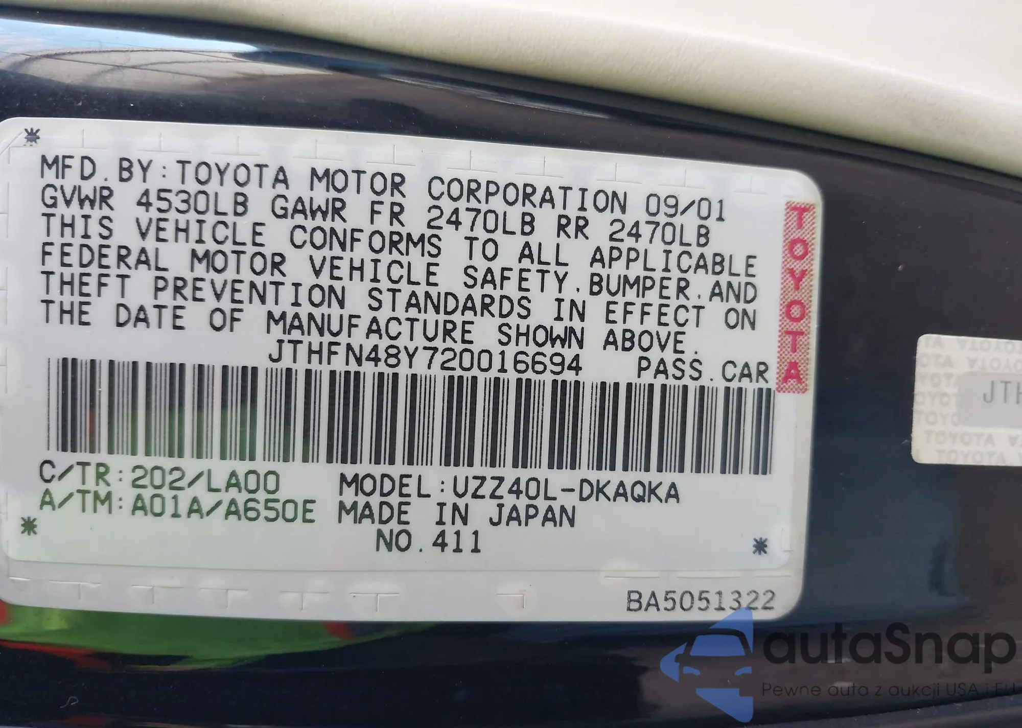 LOT: 43830508 VIN: JTHFN48Y720016694