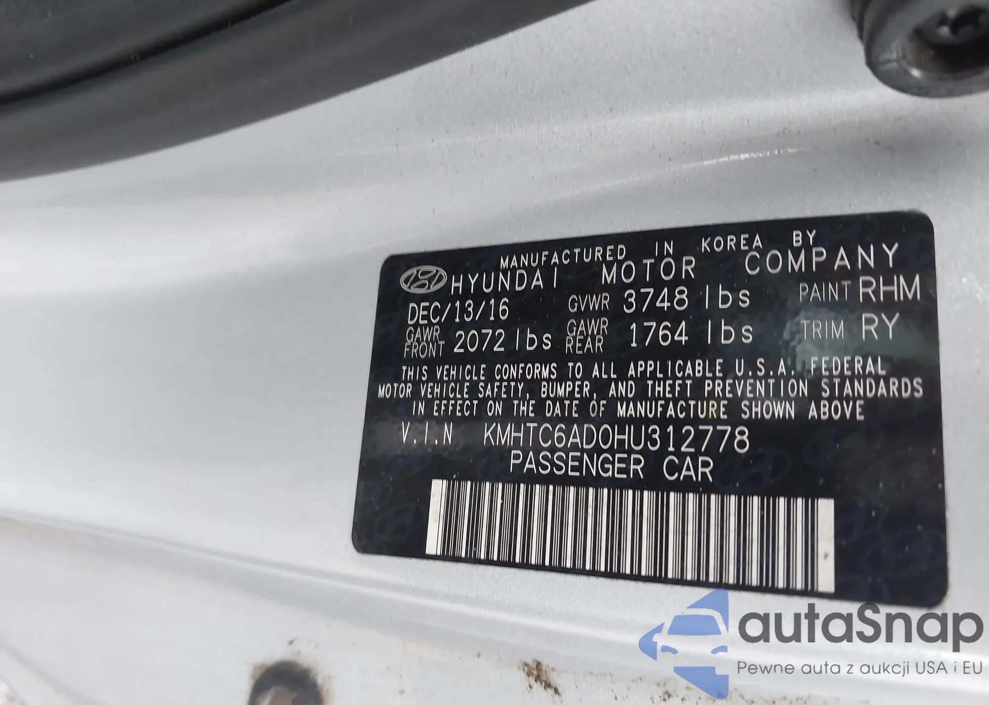 LOT: 43876158 VIN: KMHTC6AD0HU312778