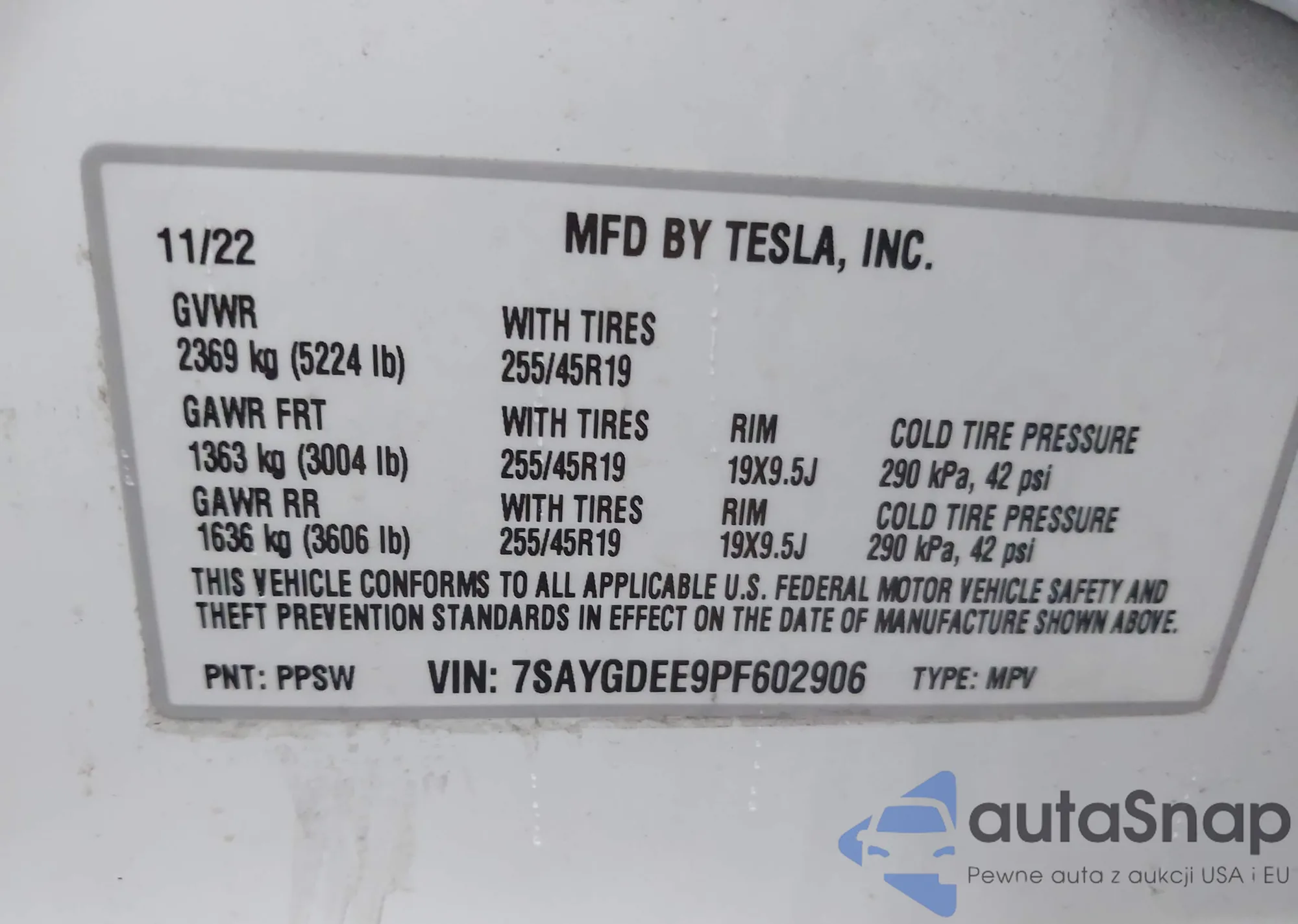 • VIN 7SAYGDEE9PF602906