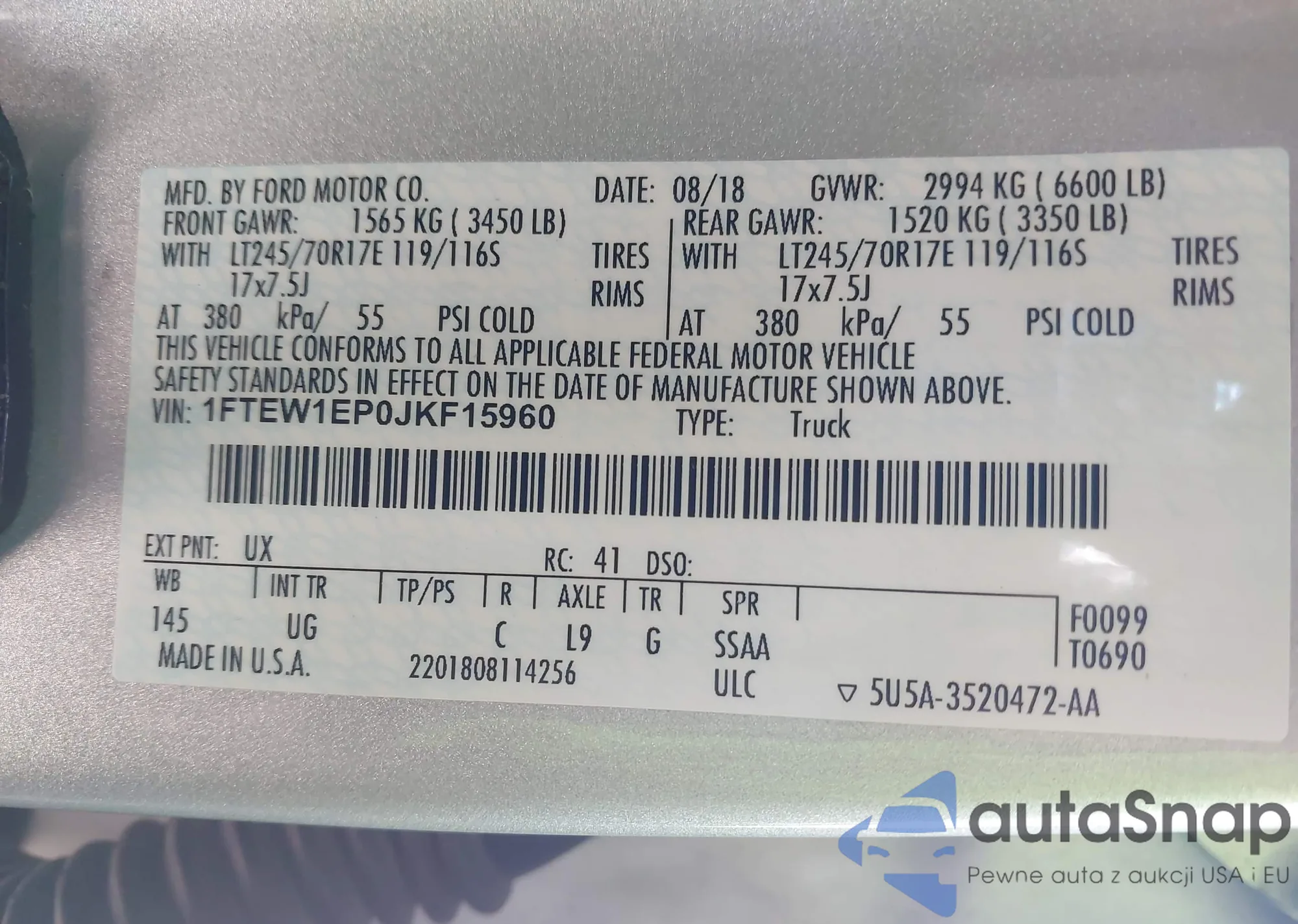 LOT: 43890685 VIN: 1FTEW1EP0JKF15960