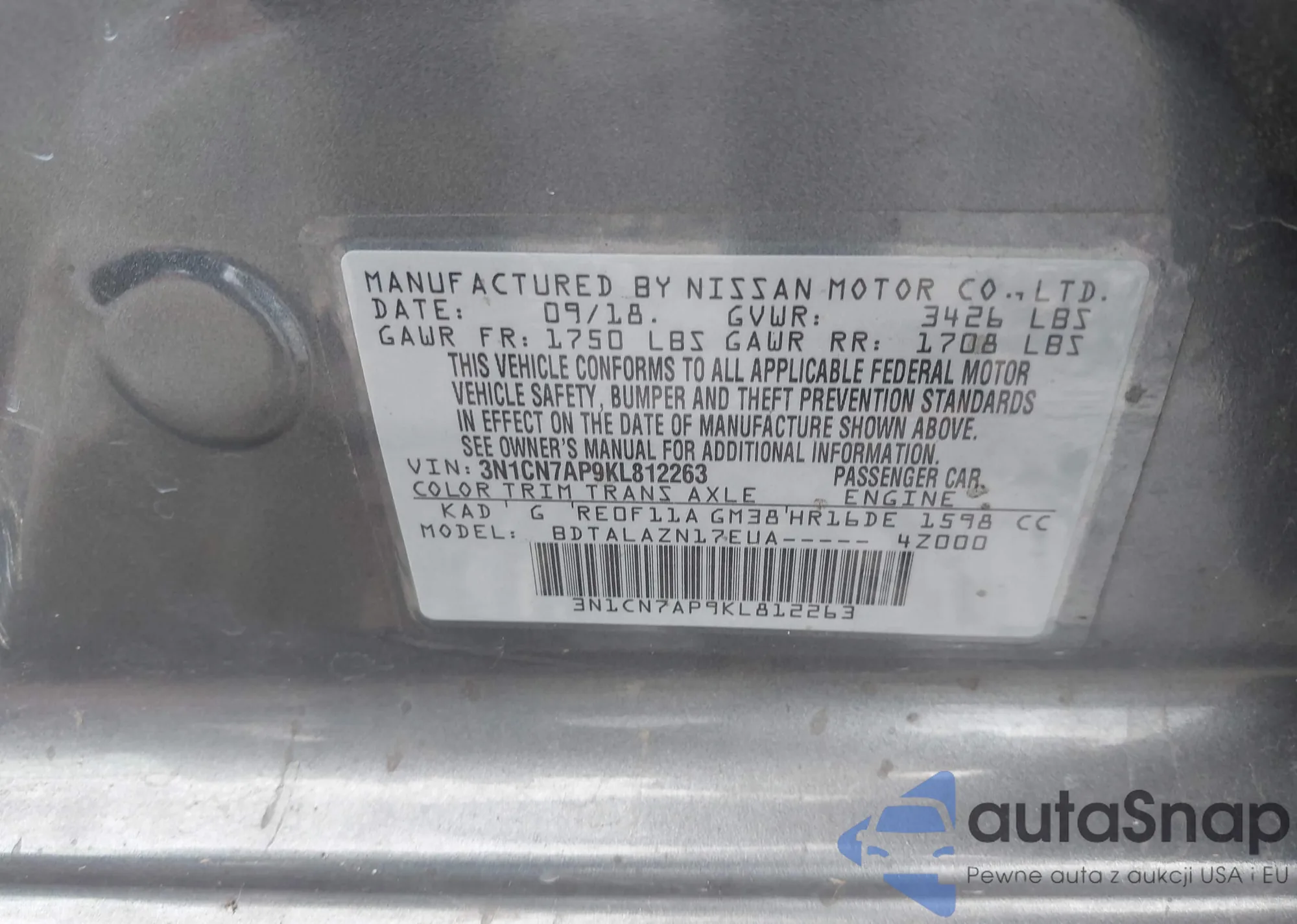 • VIN 3N1CN7AP9KL812263