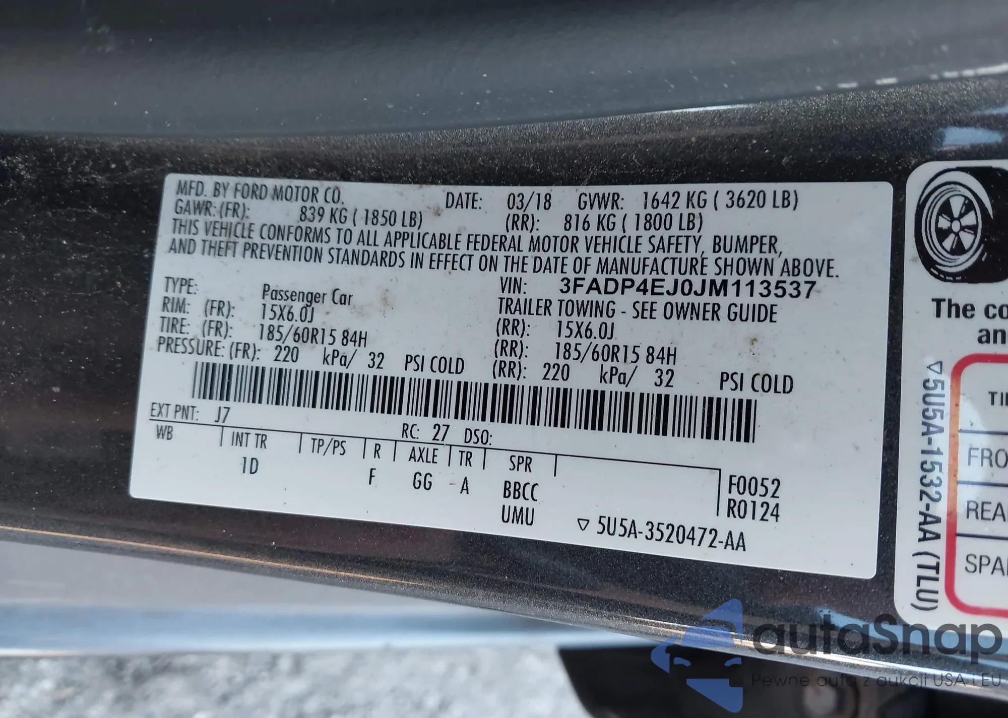 LOT: 43776827 VIN: 3FADP4EJ0JM113537