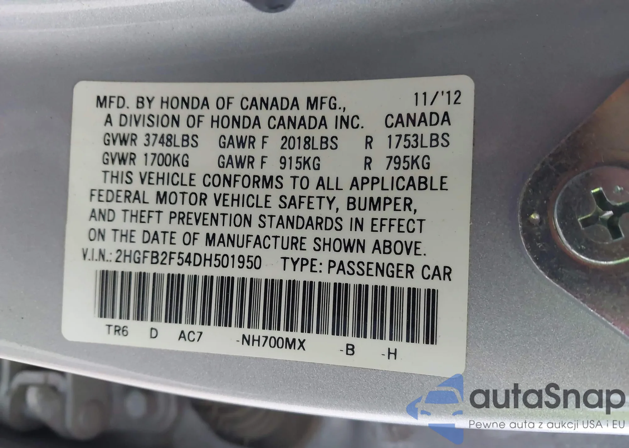 LOT: 43818818 VIN: 2HGFB2F54DH501950