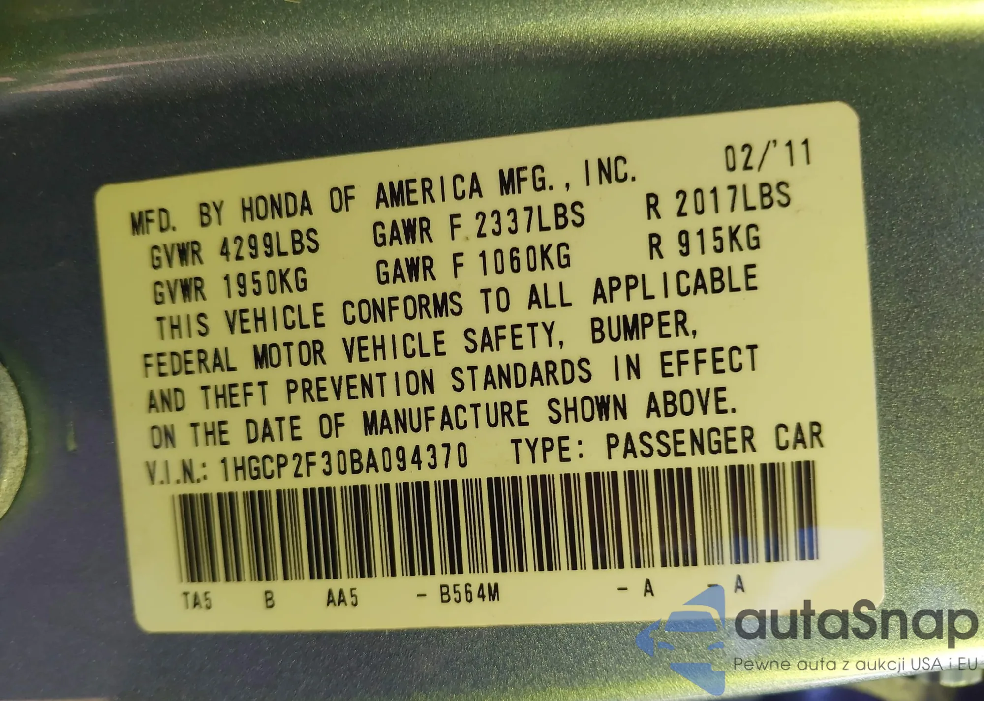 LOT: 43933416 VIN: 1HGCP2F30BA094370