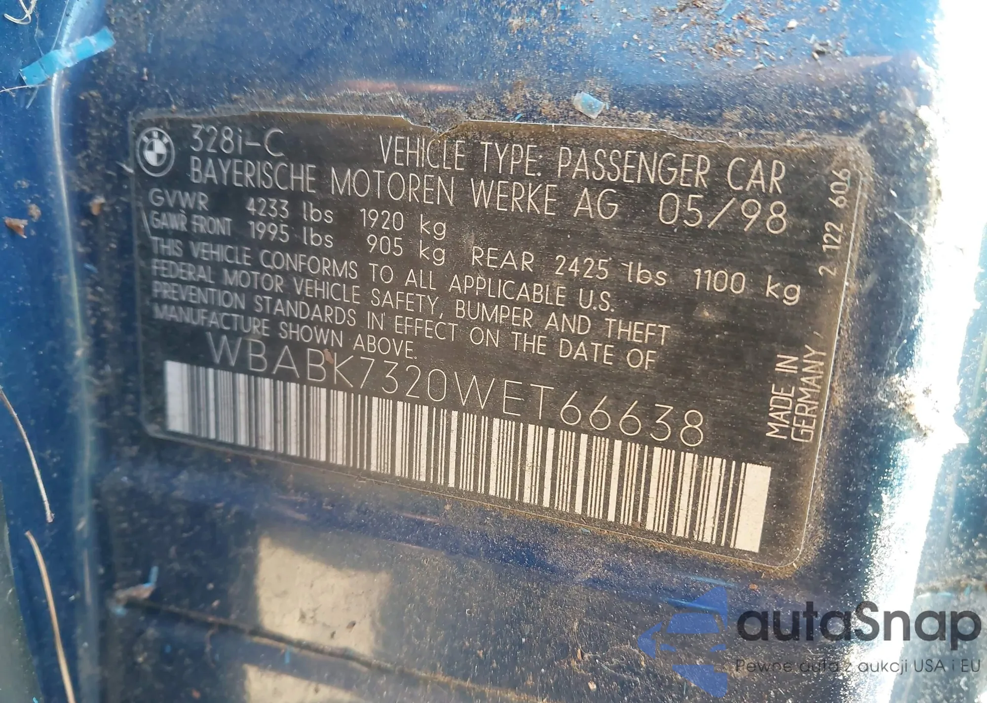 1998 BMW 328Ic from USA, damaged, VIN WBABK7320WET66638