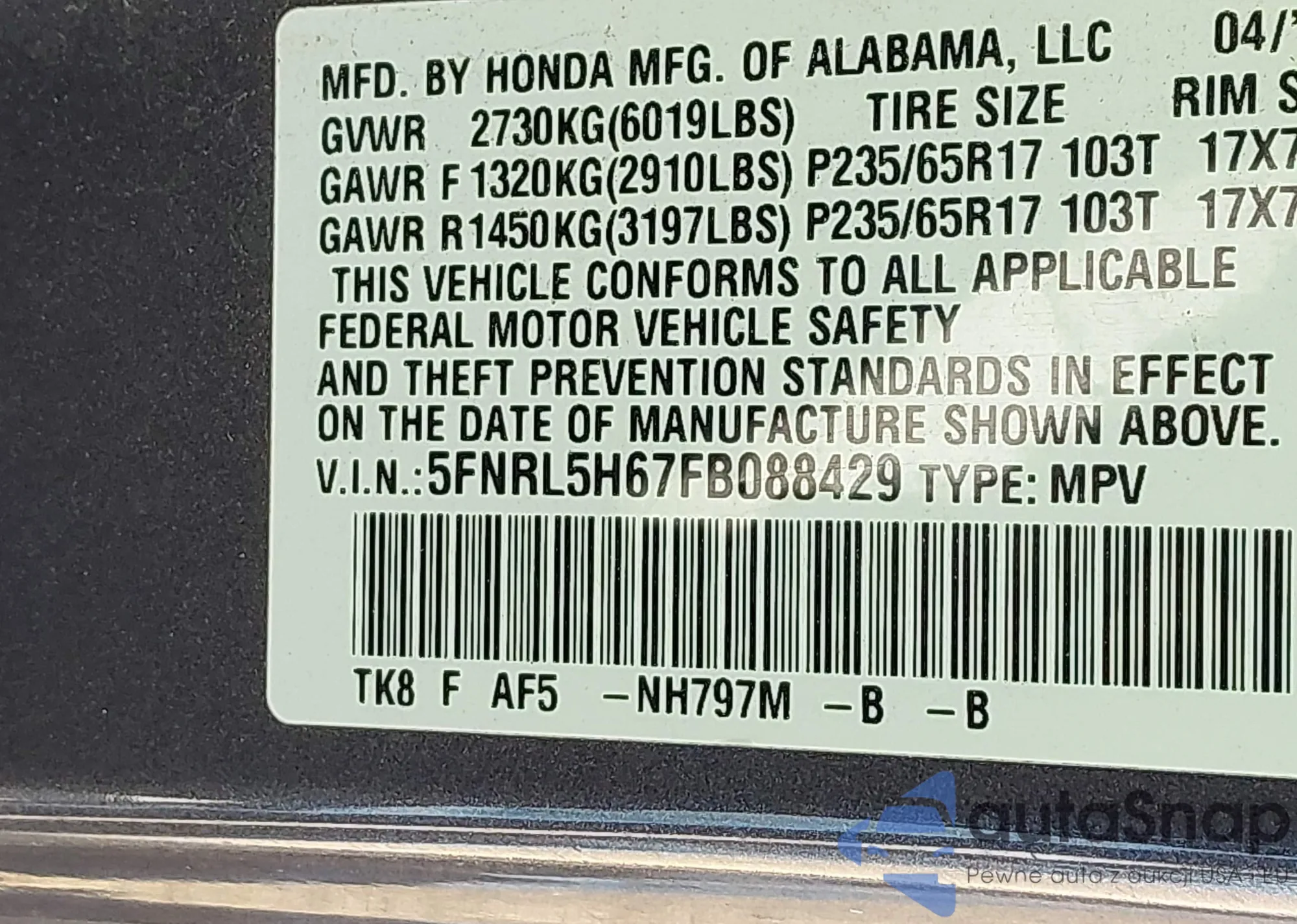 • VIN 5FNRL5H67FB088429