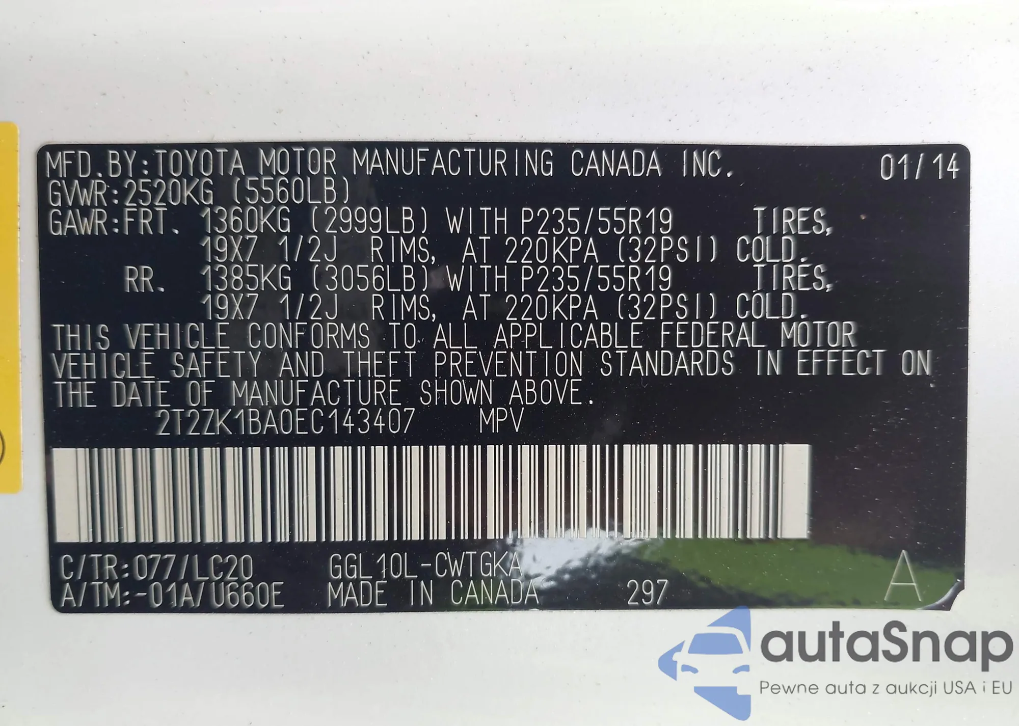 • VIN 2T2ZK1BA0EC143407