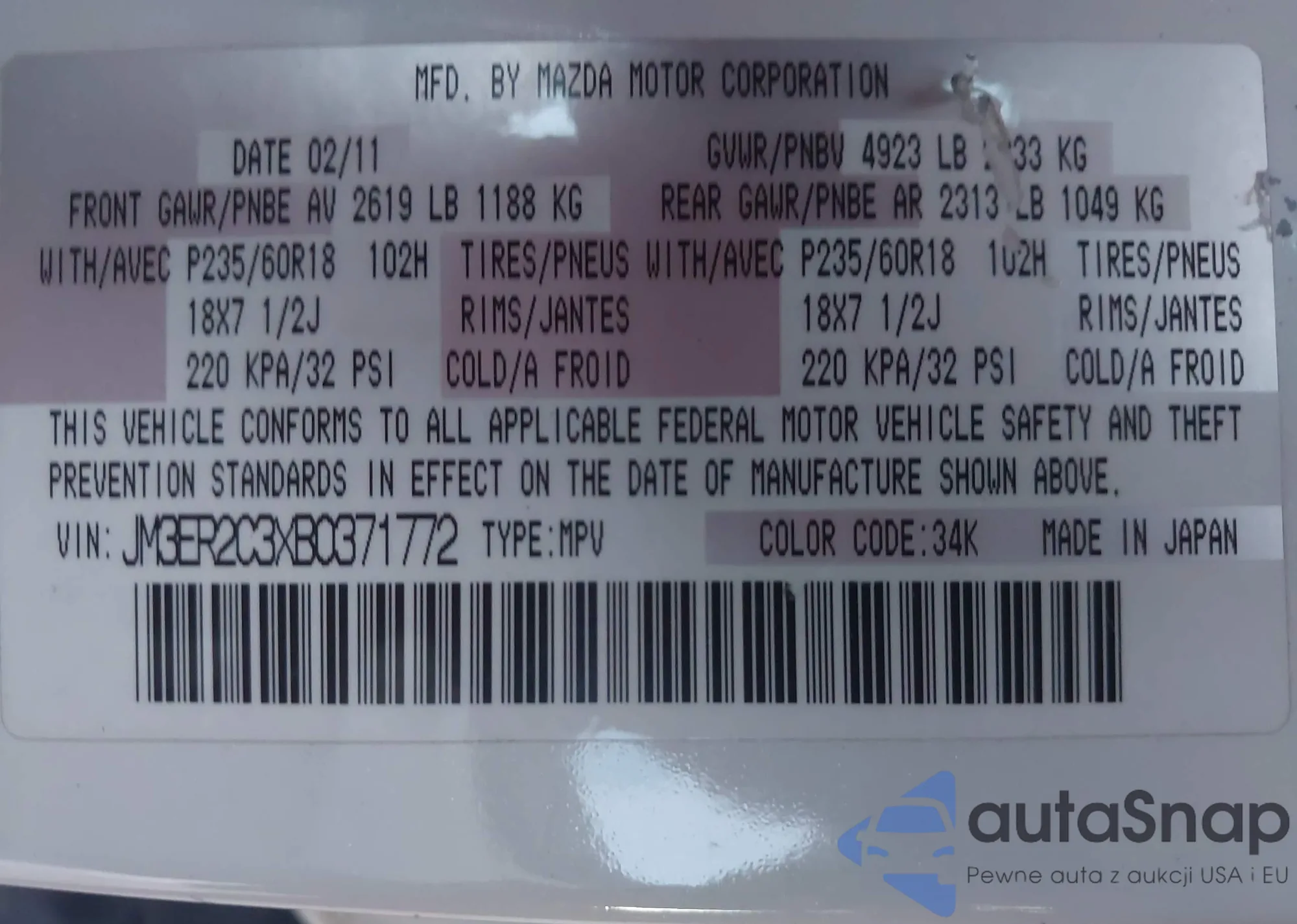LOT: 43864482 VIN: JM3ER2C3XB0371772