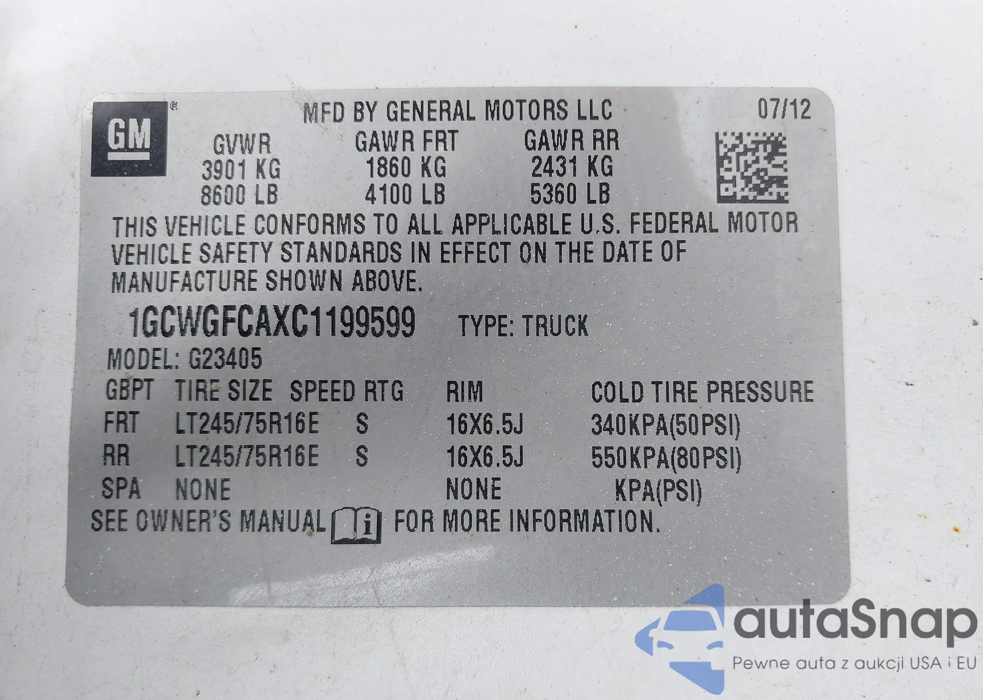 LOT: 43873059 VIN: 1GCWGFCAXC1199599