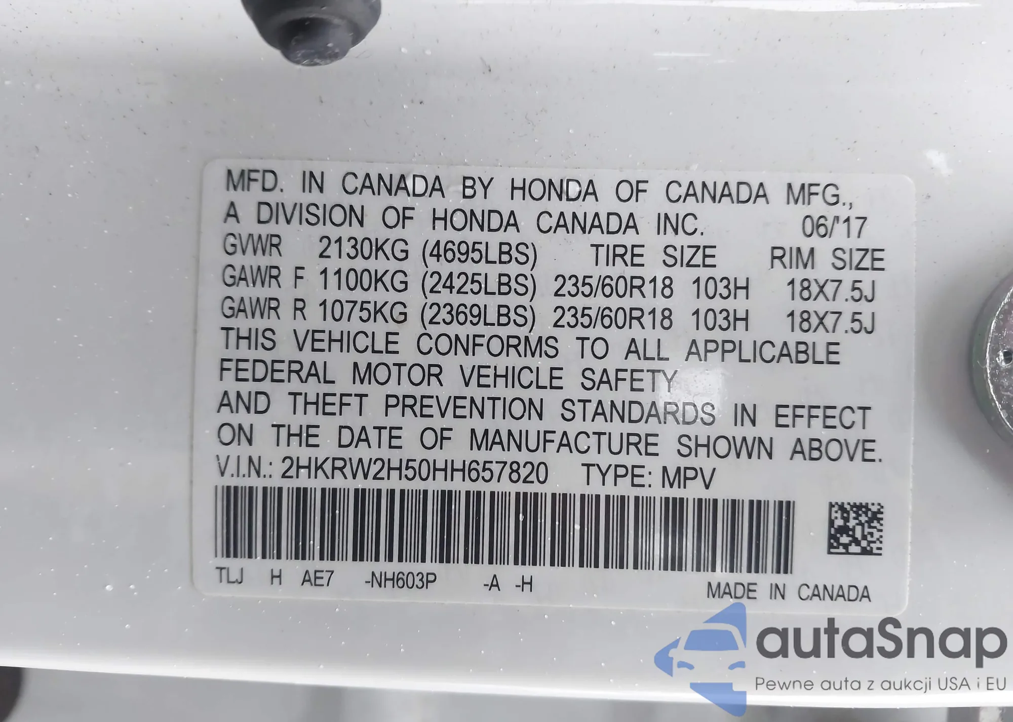 • VIN 2HKRW2H50HH657820