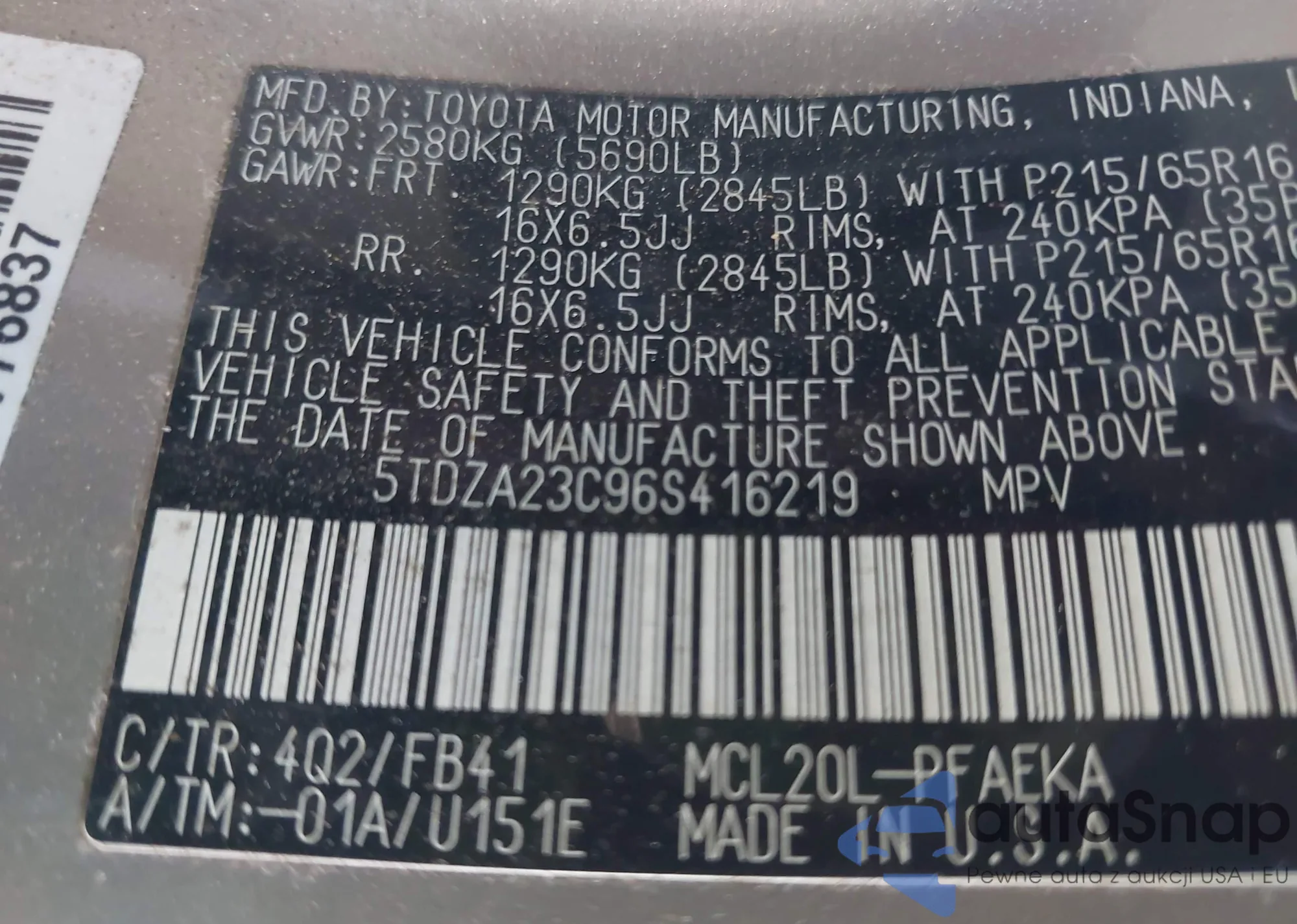LOT: 44036622 VIN: 5TDZA23C96S416219