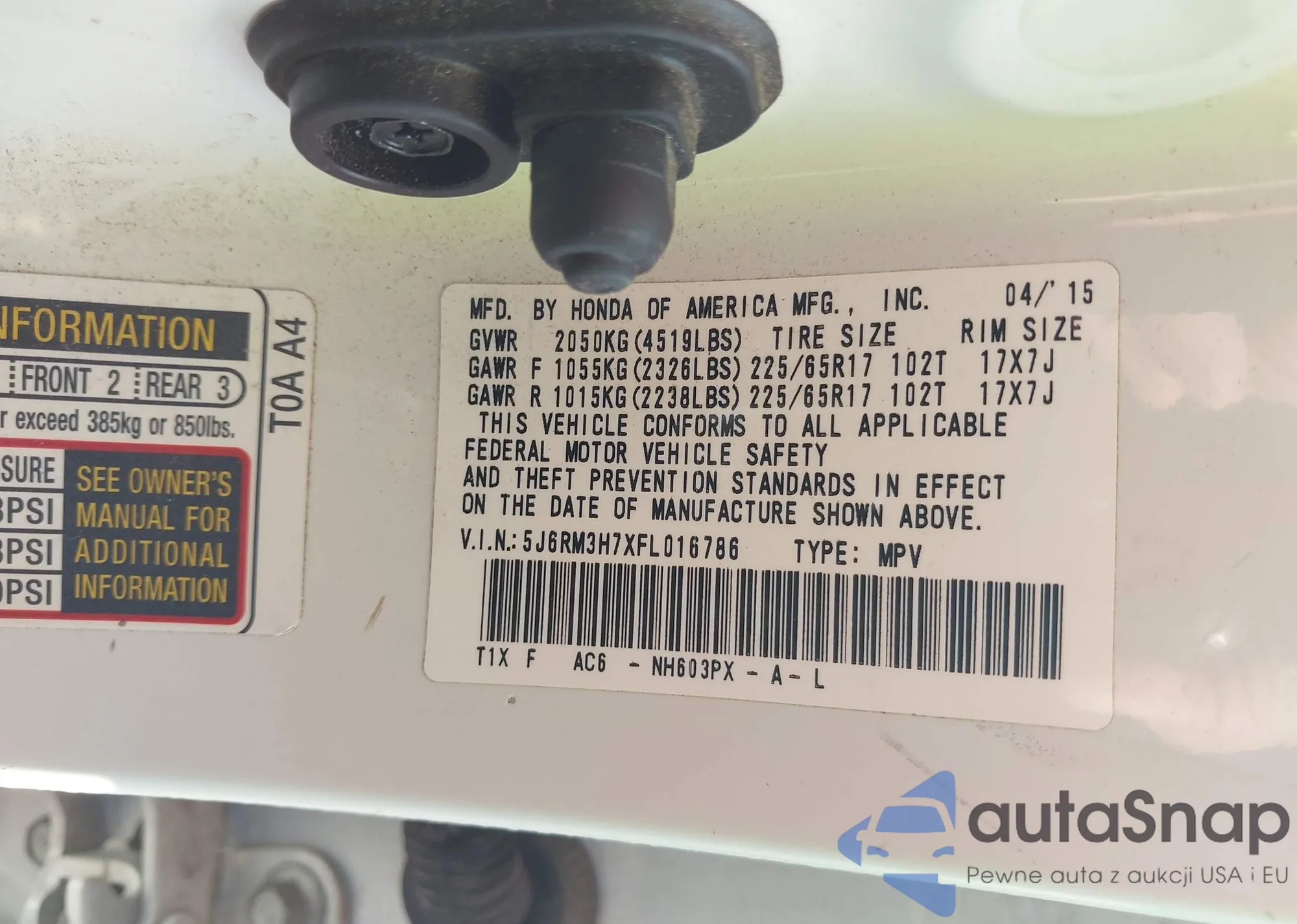 • VIN 5J6RM3H7XFL016786