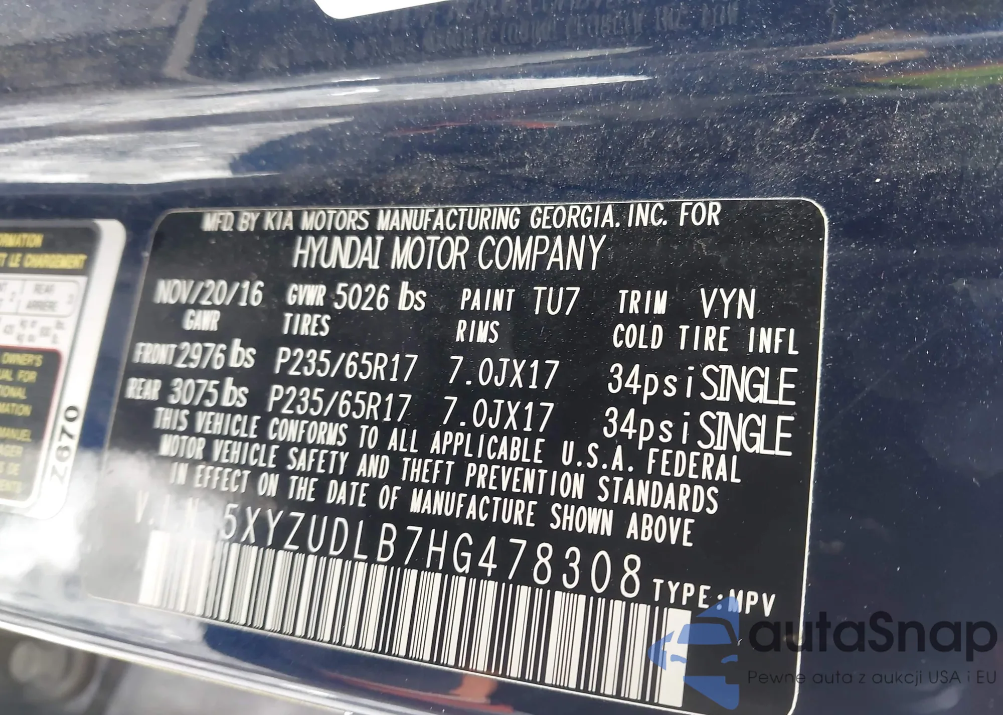 • VIN 5XYZUDLB7HG478308
