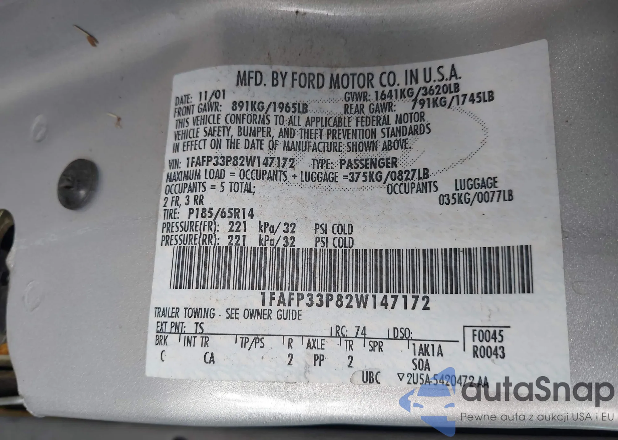 LOT: 43949854 VIN: 1FAFP33P82W147172