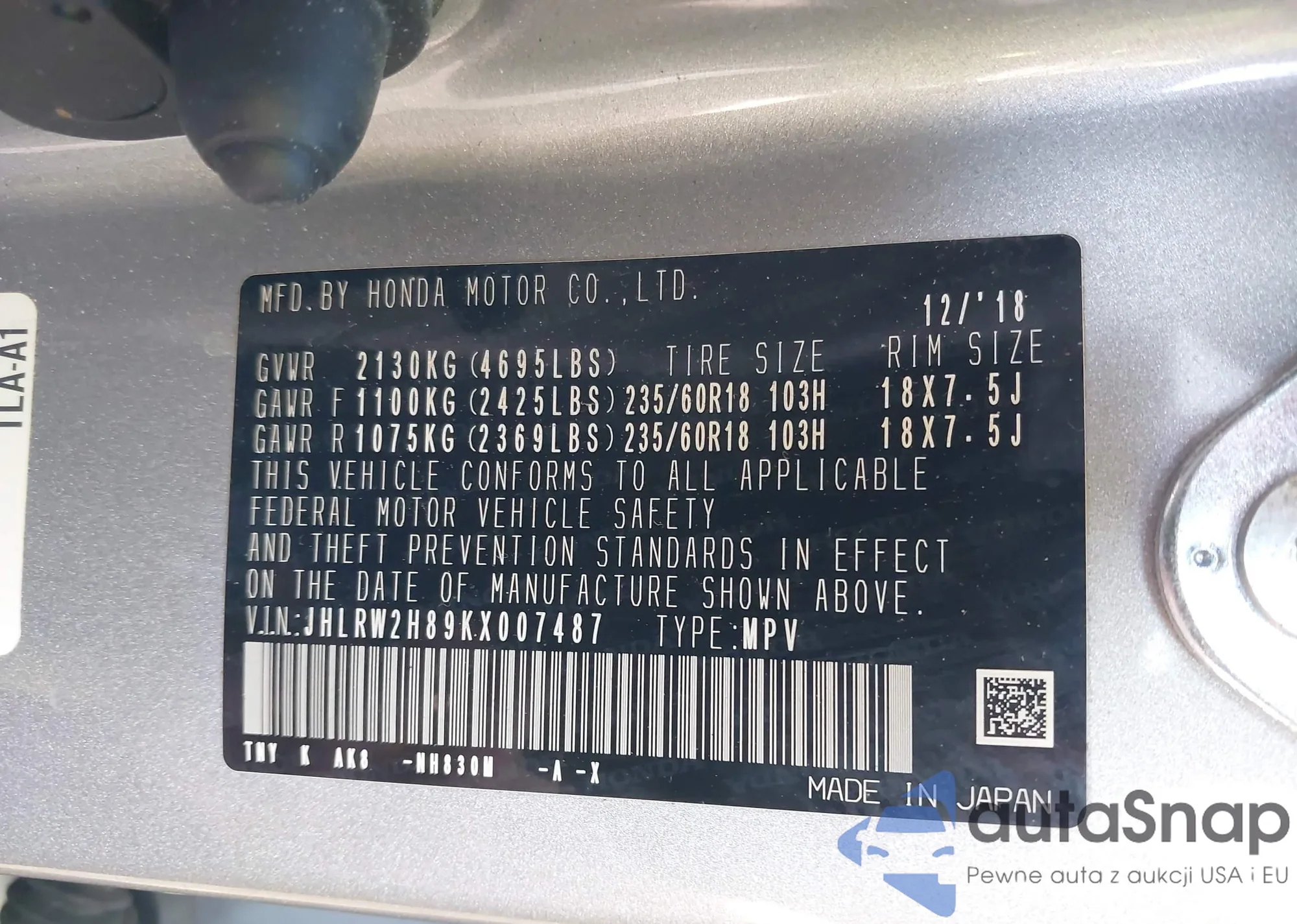 • VIN JHLRW2H89KX007487