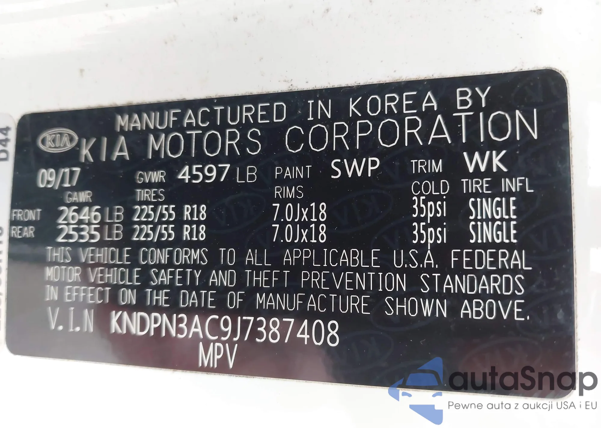 LOT: 44170712 VIN: KNDPN3AC9J7387408