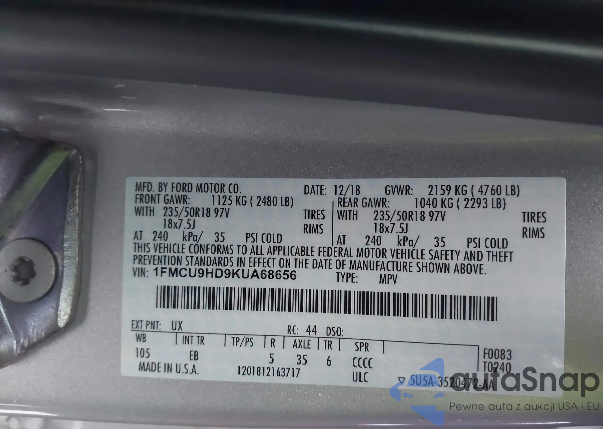 • VIN 1FMCU9HD9KUA68656