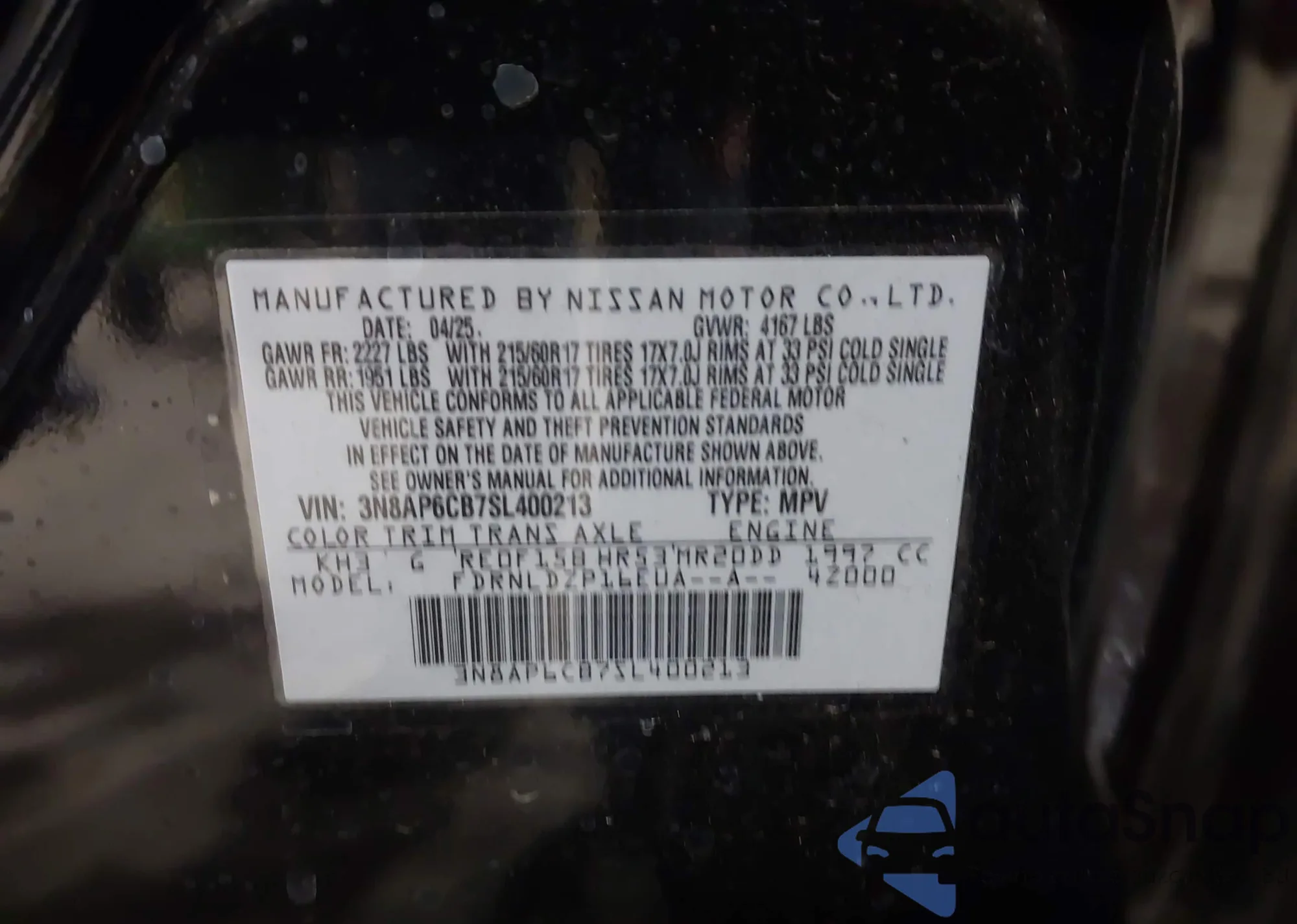 LOT: 43940469 VIN: 3N8AP6CB7SL400213
