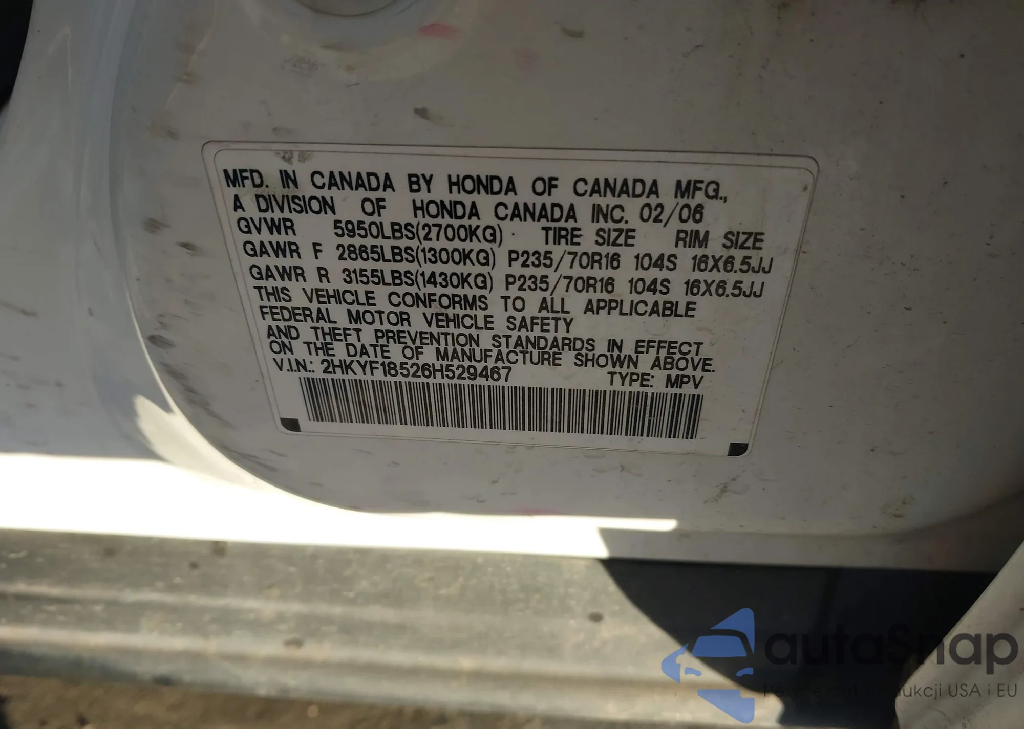 • VIN 2HKYF18526H529467