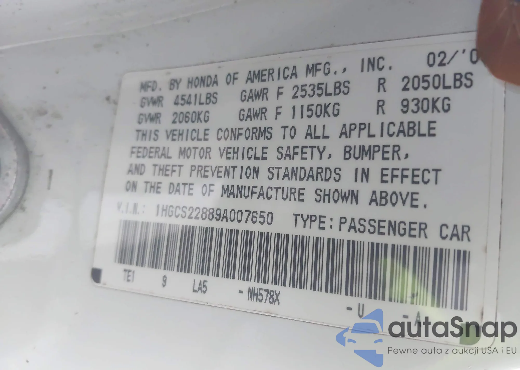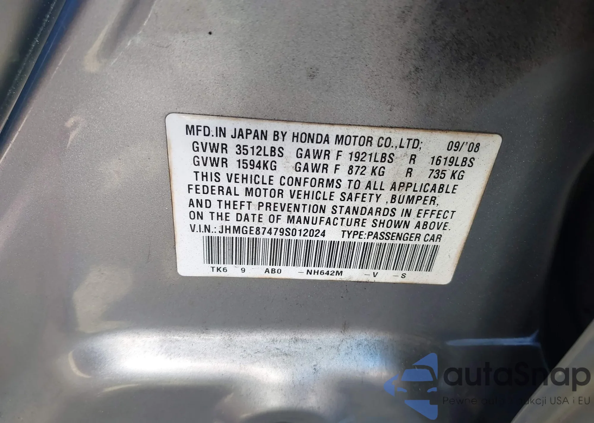 LOT: 44128499 VIN: JHMGE87479S012024