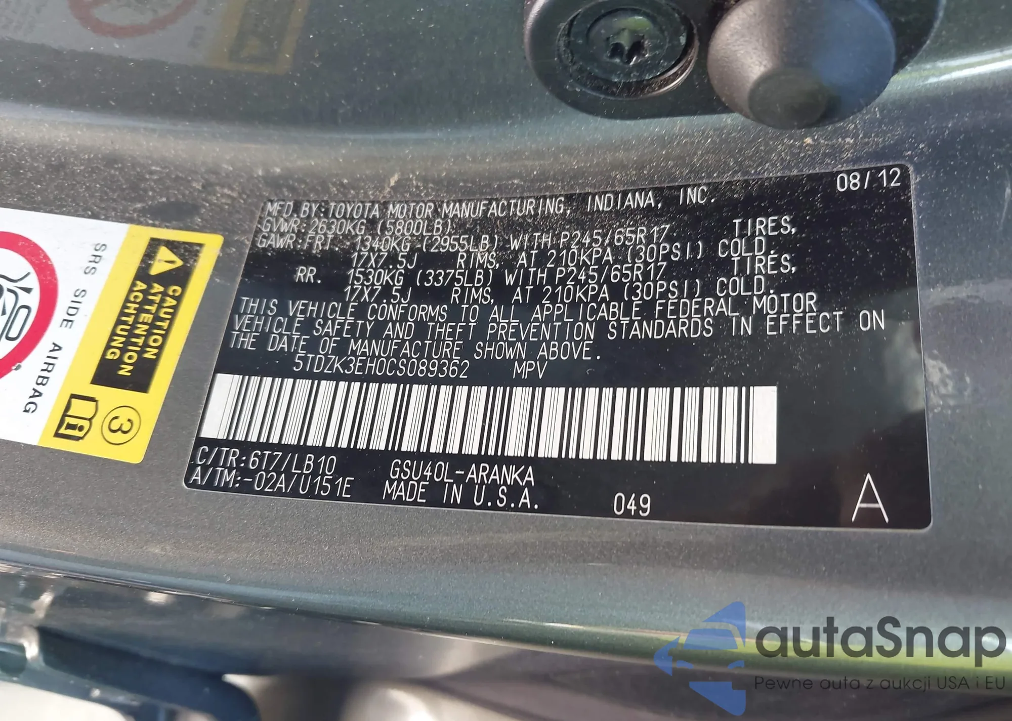 • VIN 5TDZK3EH0CS089362