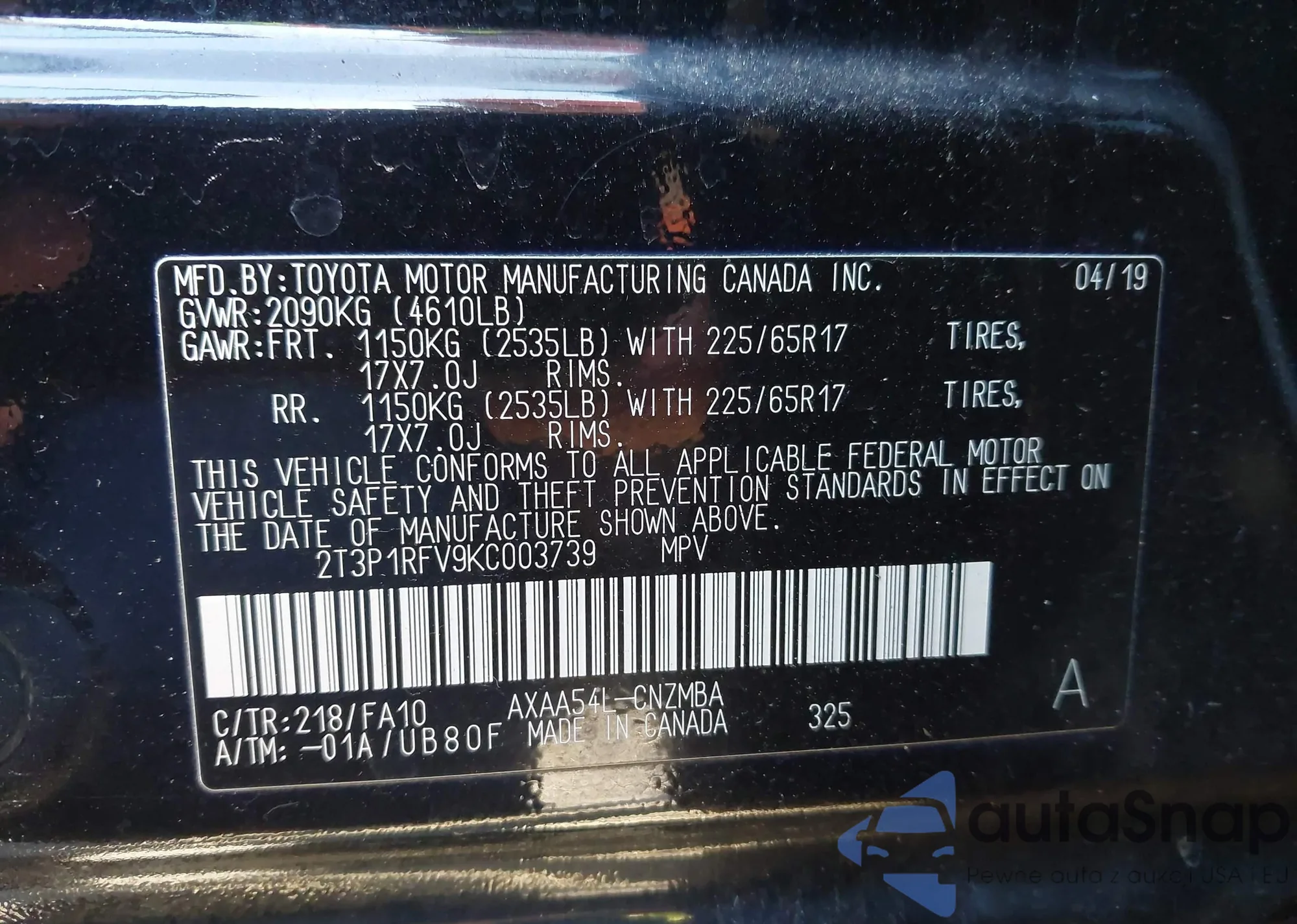 • VIN 2T3P1RFV9KC003739