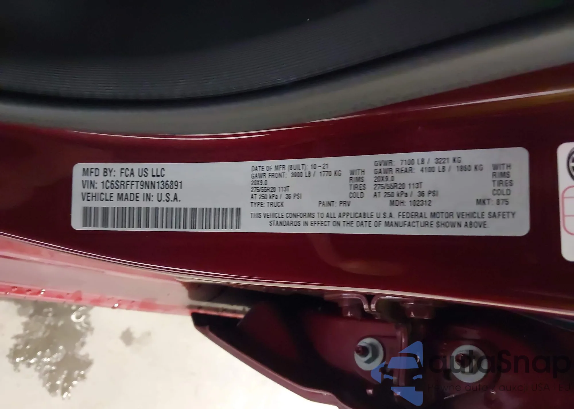 LOT: 43777547 VIN: 1C6SRFFT9NN136891