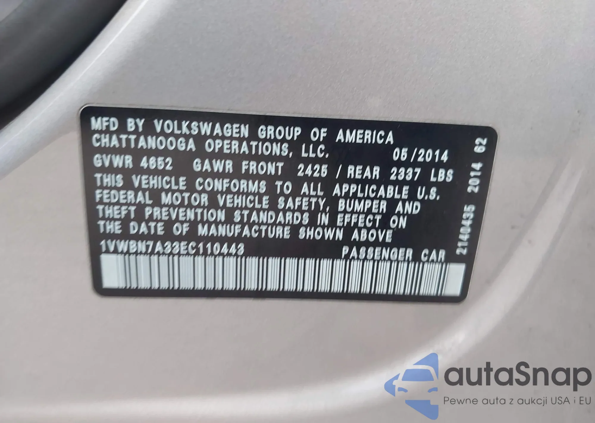 • VIN 1VWBN7A33EC110443