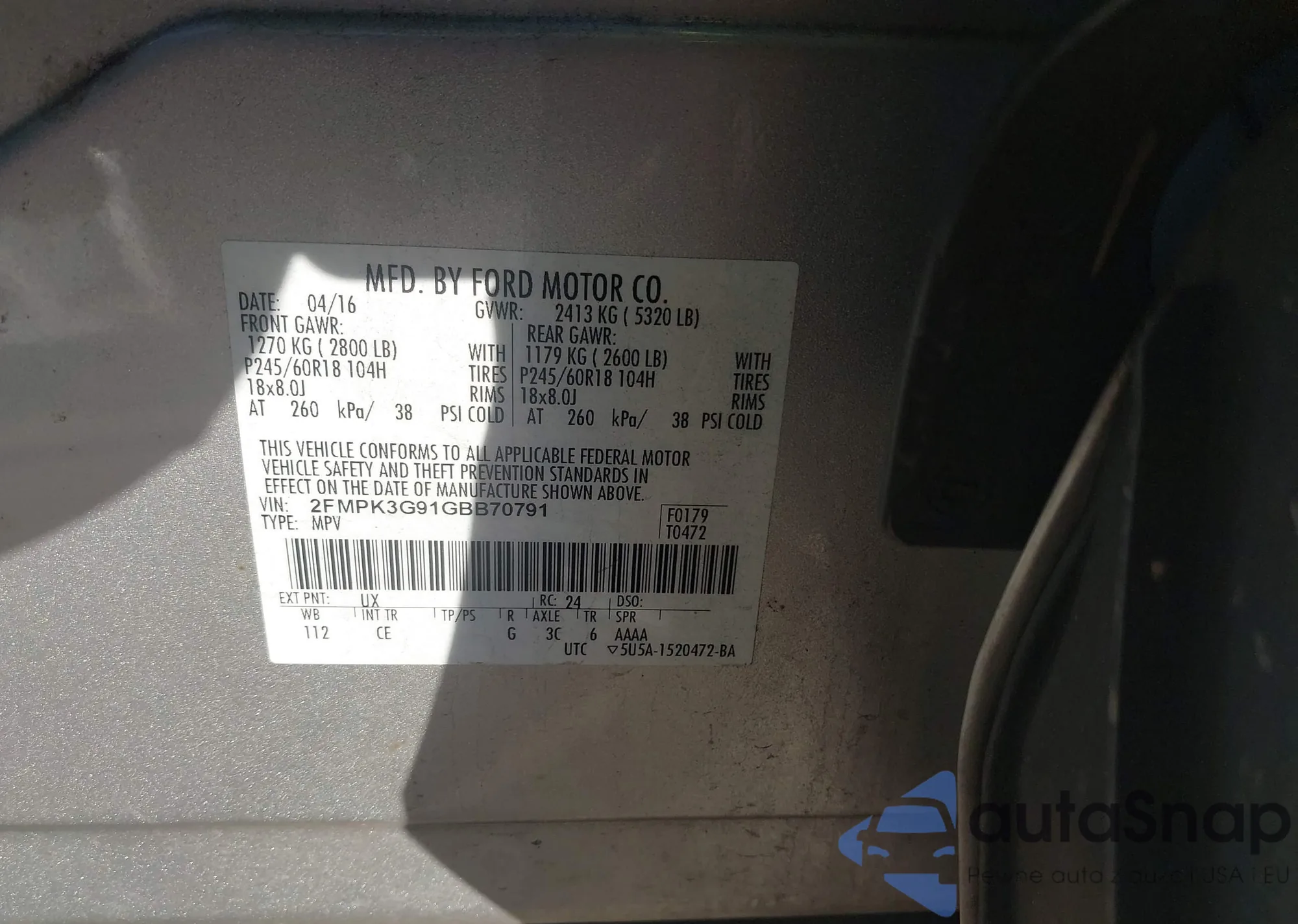 LOT: 44142993 VIN: 2FMPK3G91GBB70791