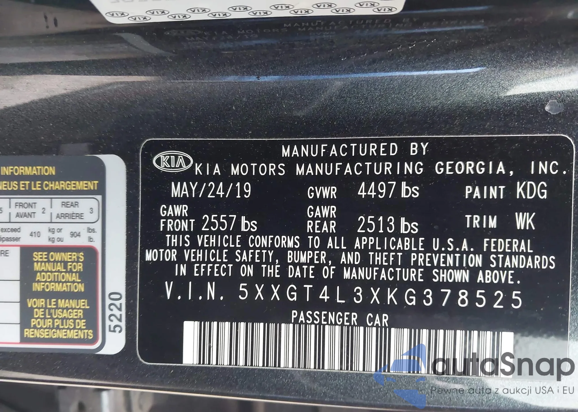 LOT: 44145846 VIN: 5XXGT4L3XKG378525
