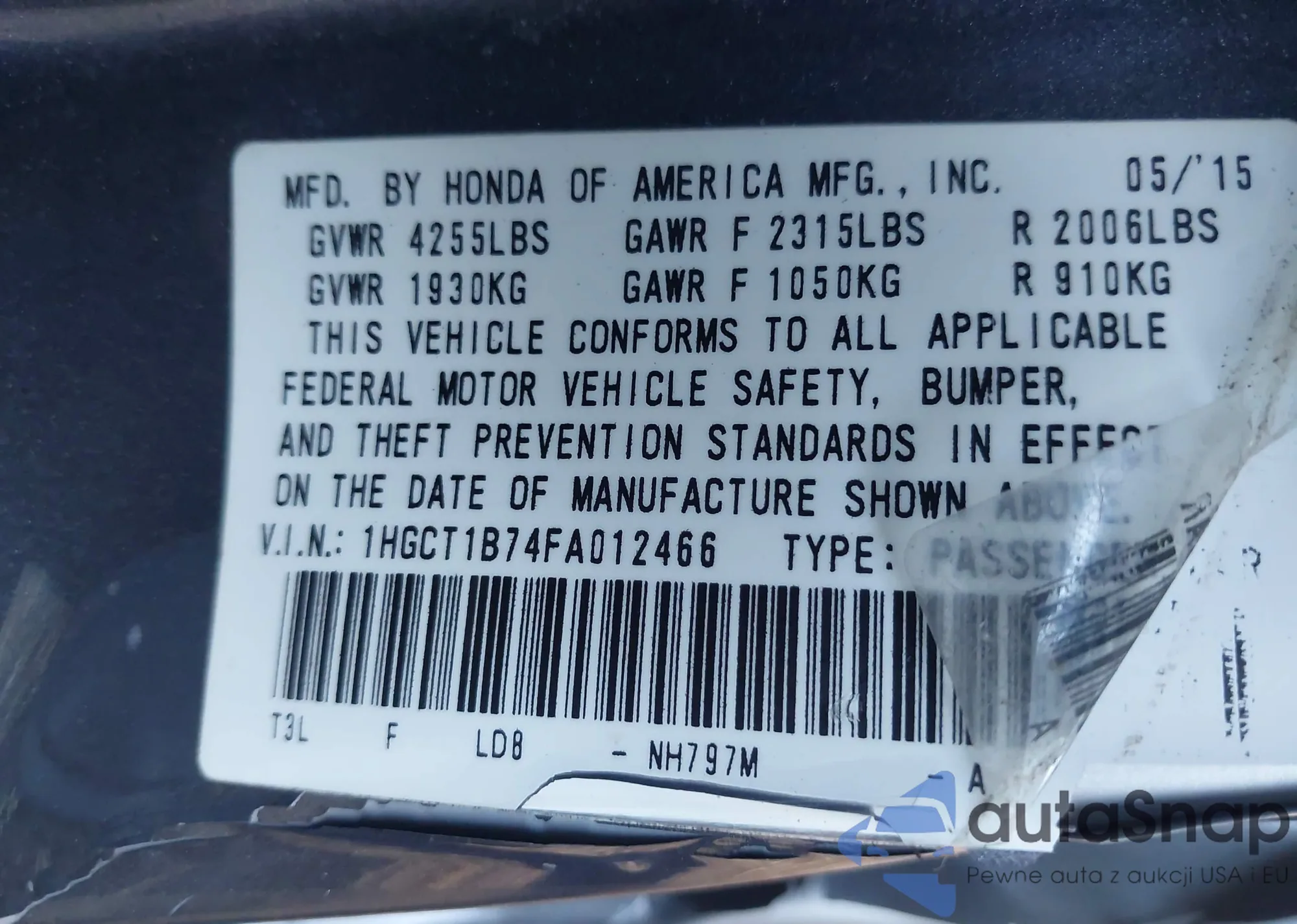 LOT: 43925496 VIN: 1HGCT1B74FA012466