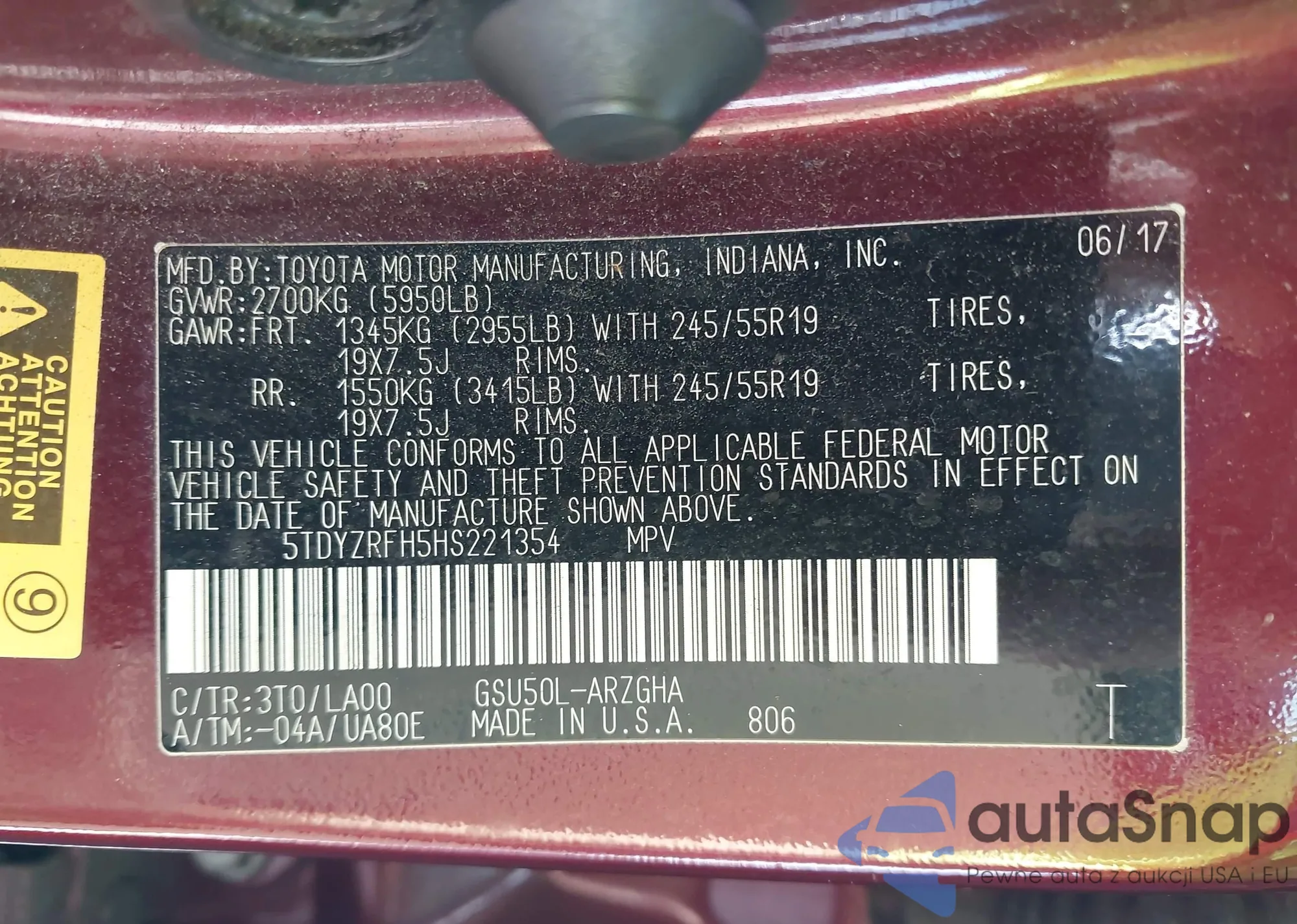 LOT: 44150084 VIN: 5TDYZRFH5HS221354
