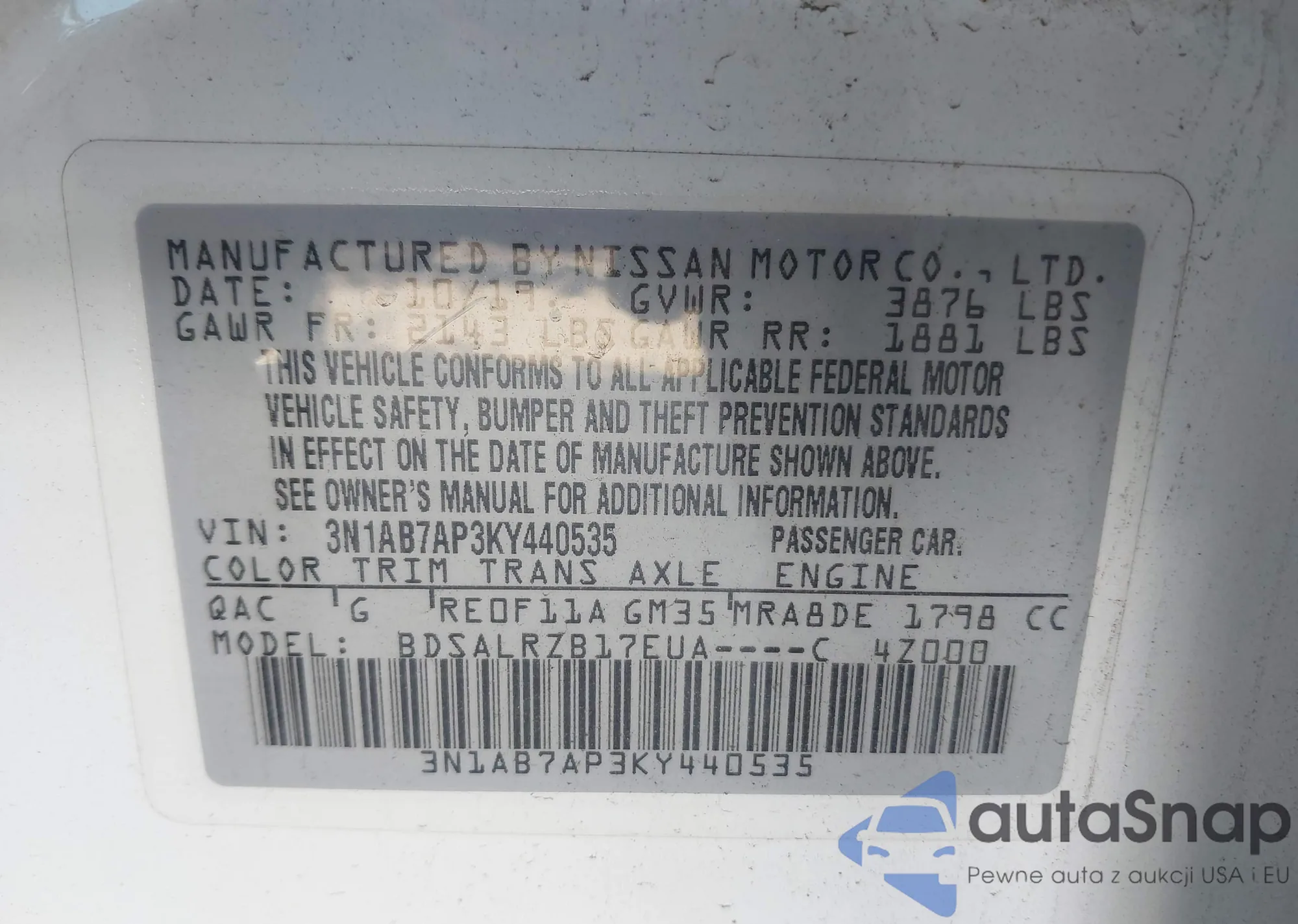LOT: 43931378 VIN: 3N1AB7AP3KY440535