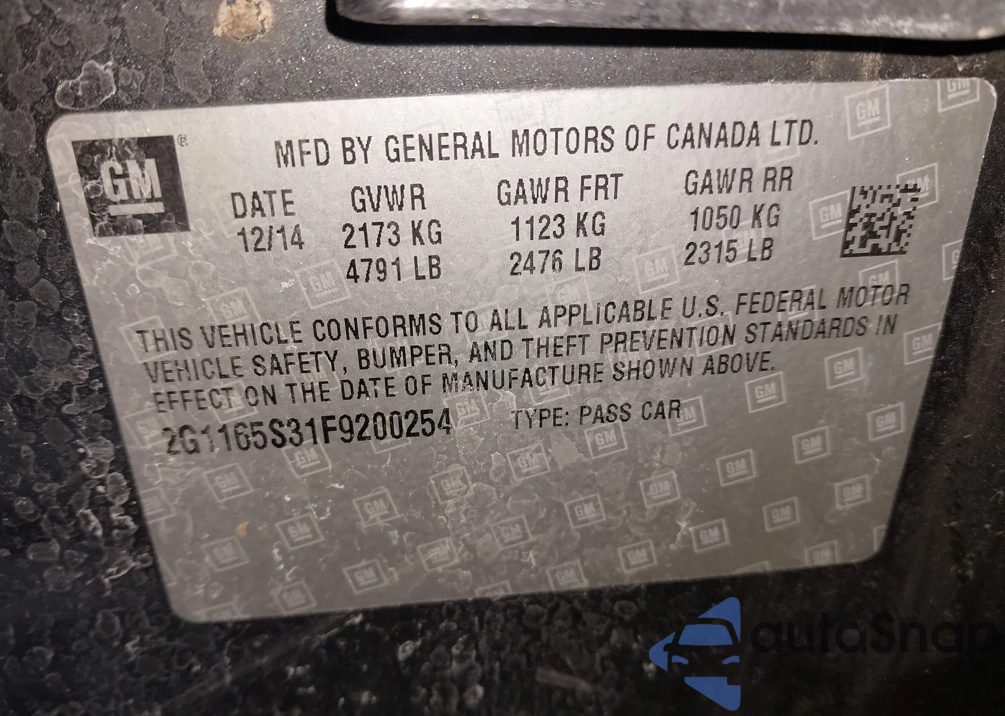 • VIN 2G1165S31F9200254