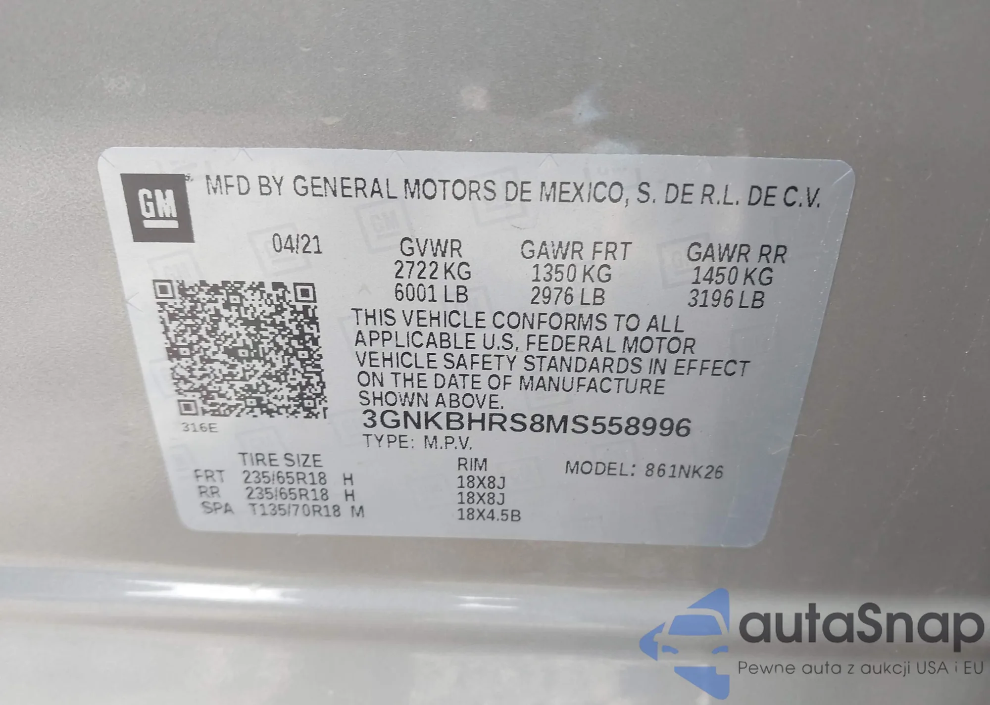 • VIN 3GNKBHRS8MS558996