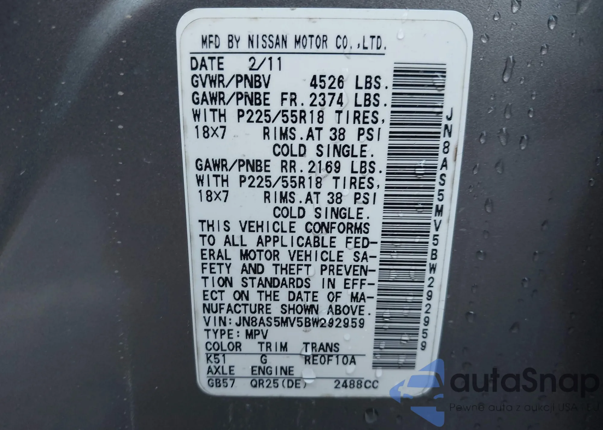 • VIN JN8AS5MV5BW292959