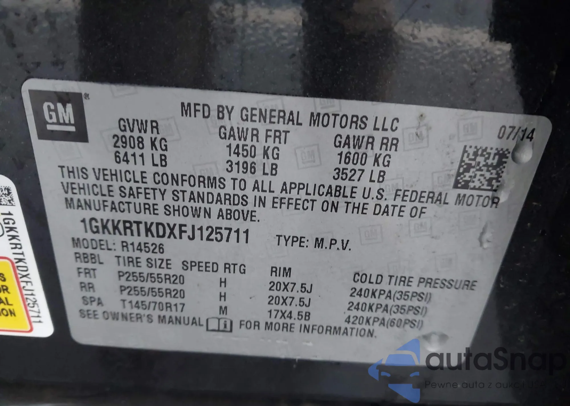 LOT: 43778165 VIN: 1GKKRTKDXFJ125711