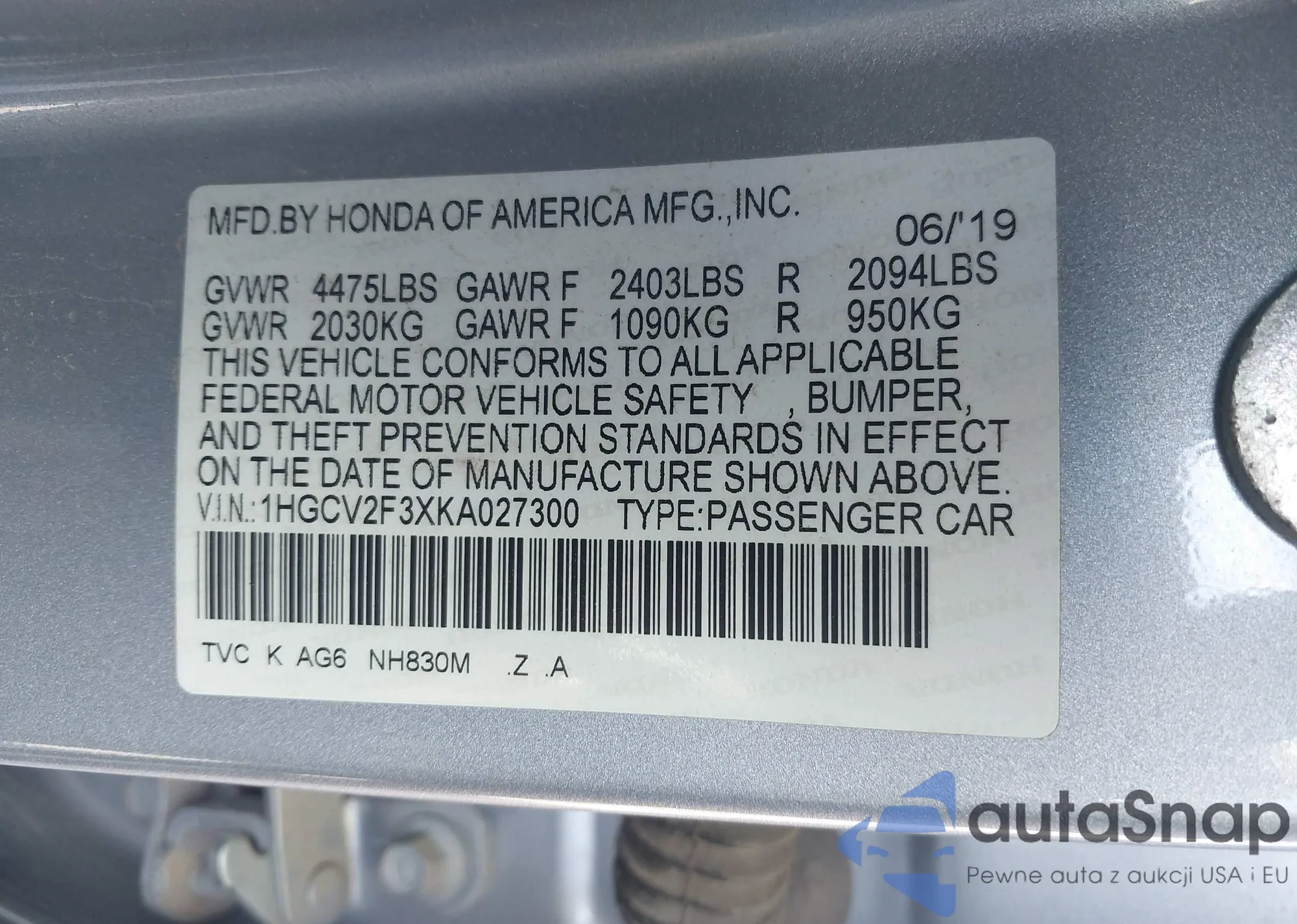 LOT: 43825899 VIN: 1HGCV2F3XKA027300