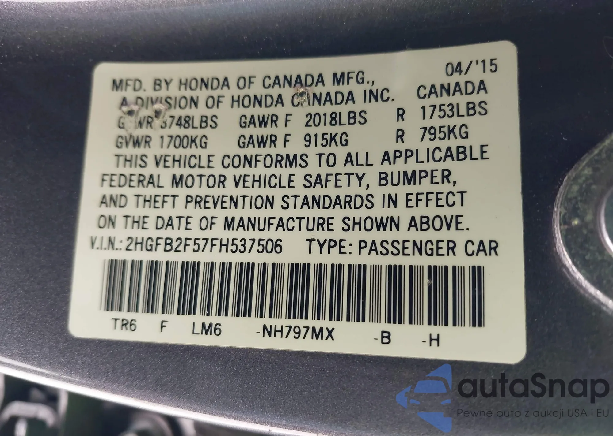 LOT: 43851794 VIN: 2HGFB2F57FH537506