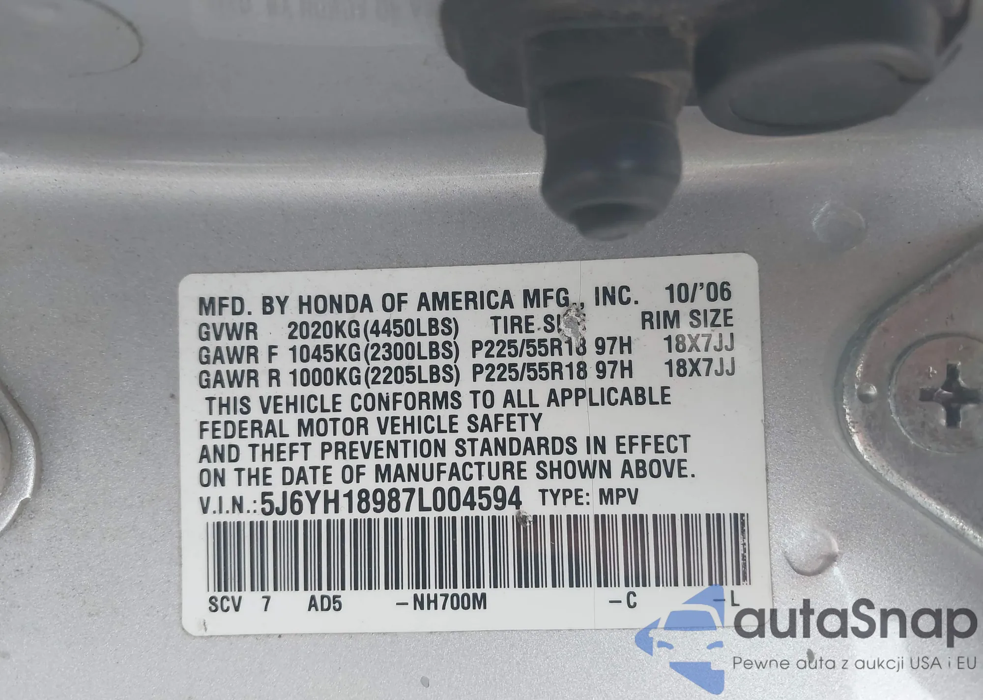 LOT: 43939850 VIN: JHMFC1F77JX003710