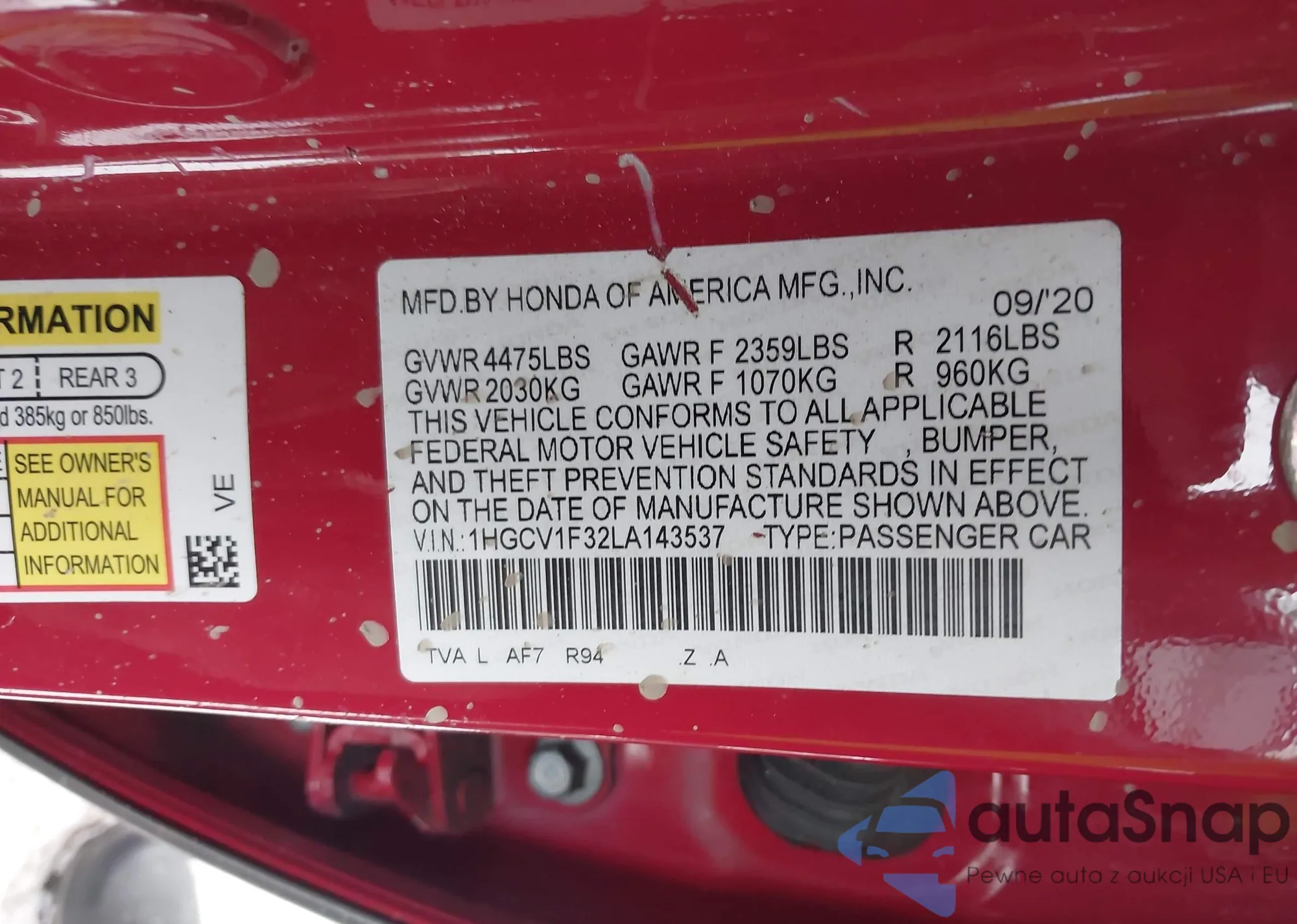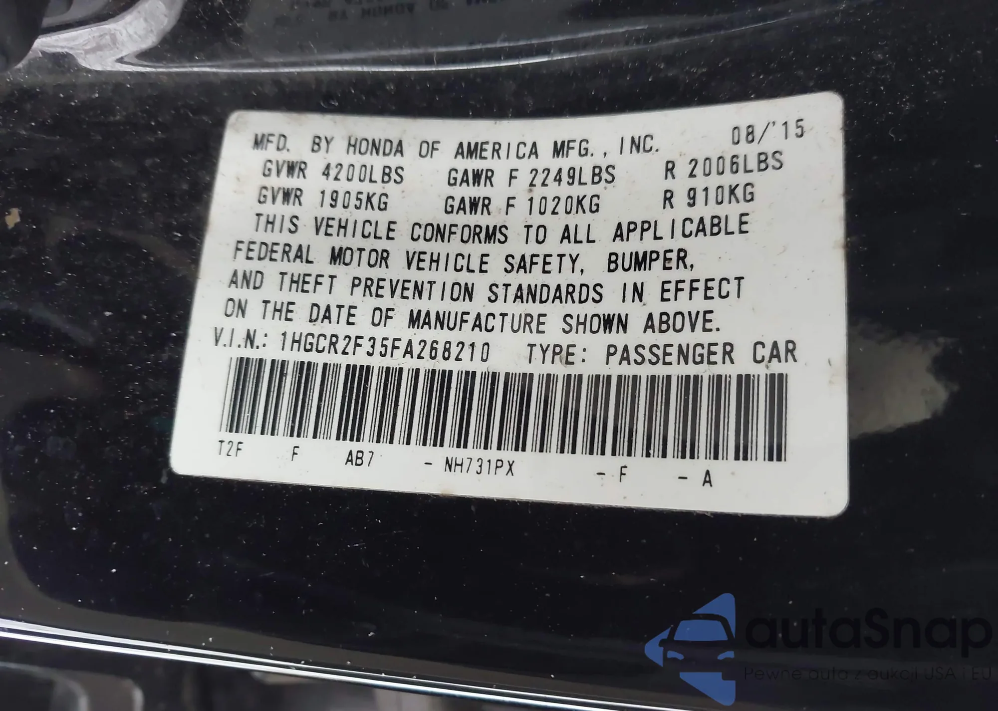 LOT: 43979949 VIN: 1HGCR2F35FA268210
