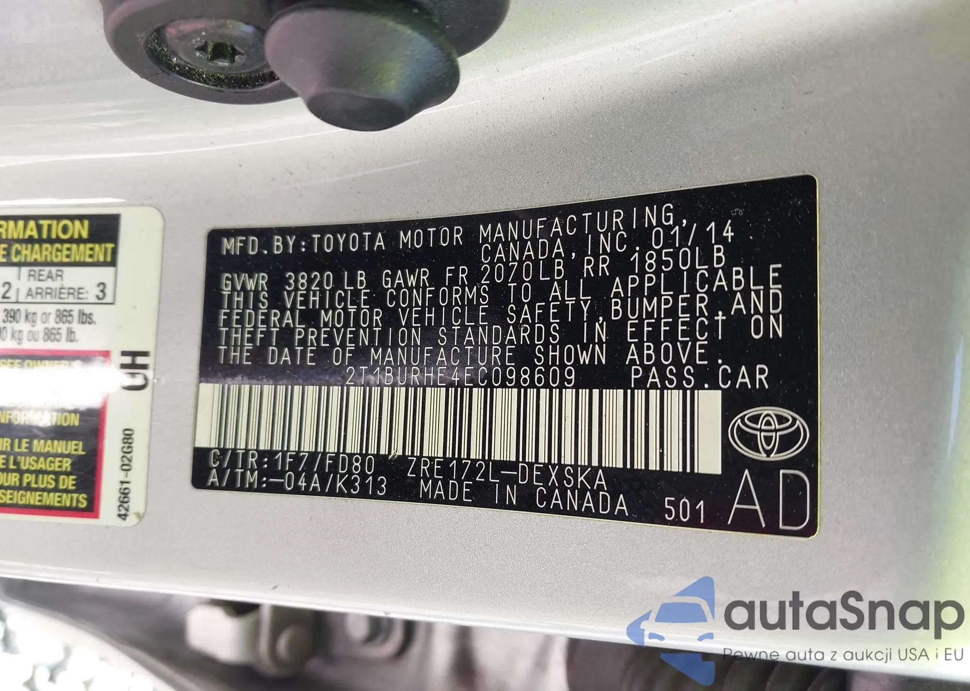 LOT: 44164331 VIN: 2T1BURHE4EC098609