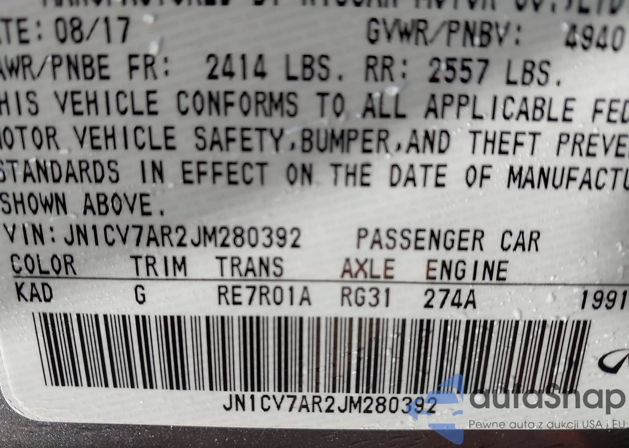 • VIN JN1CV7AR2JM280392