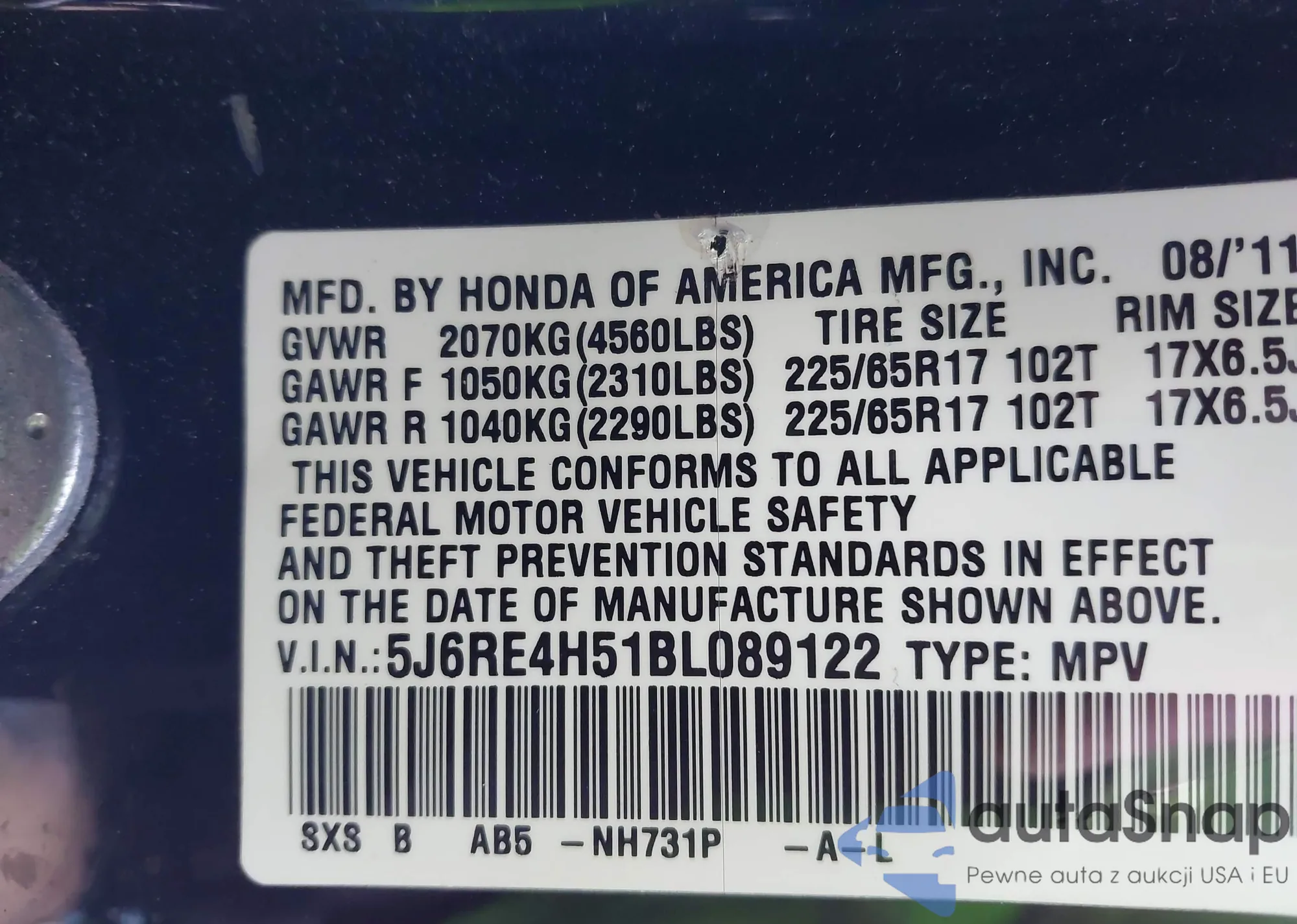 • VIN 5J6RE4H51BL089122