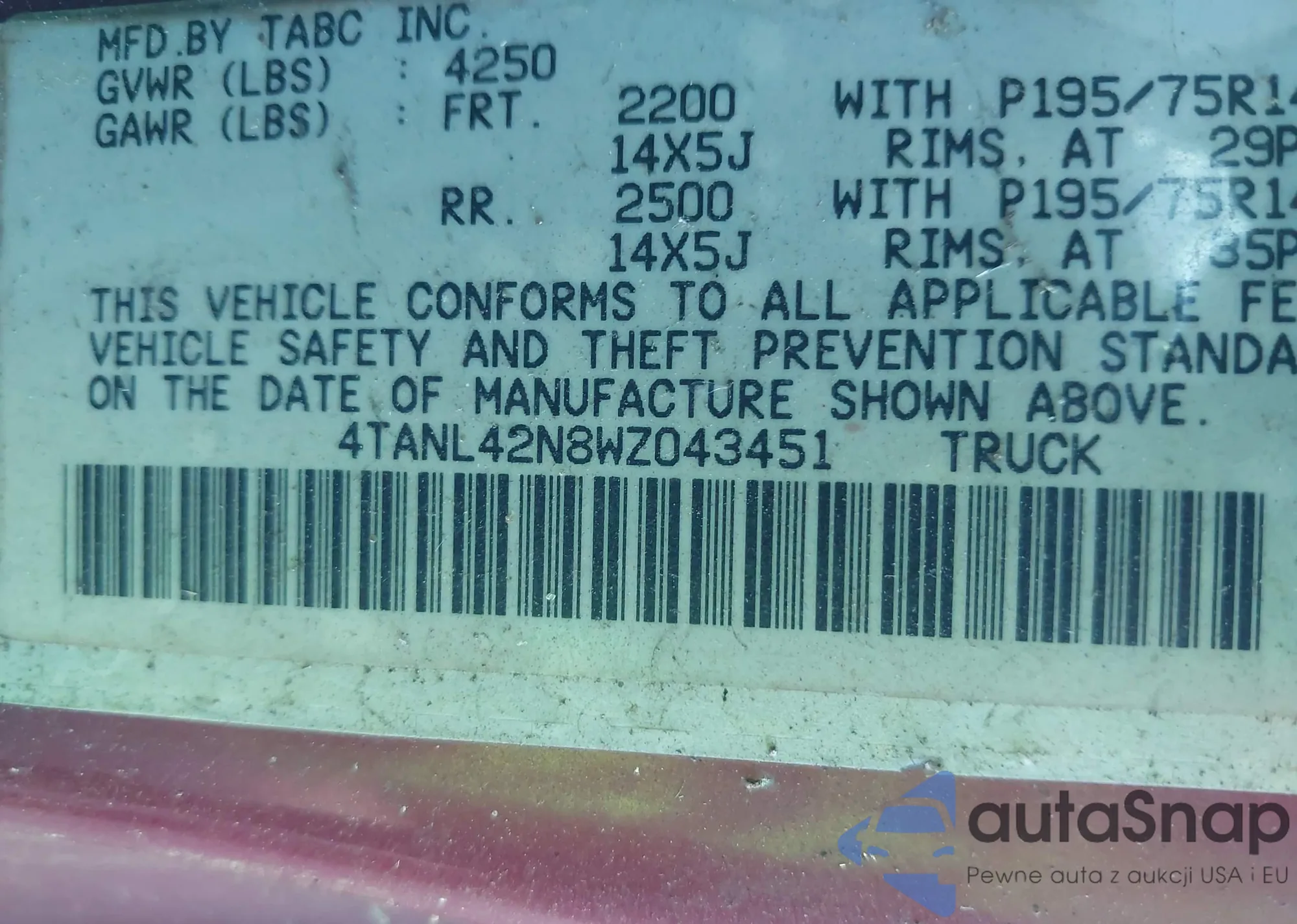 • VIN 4TANL42N8WZ043451